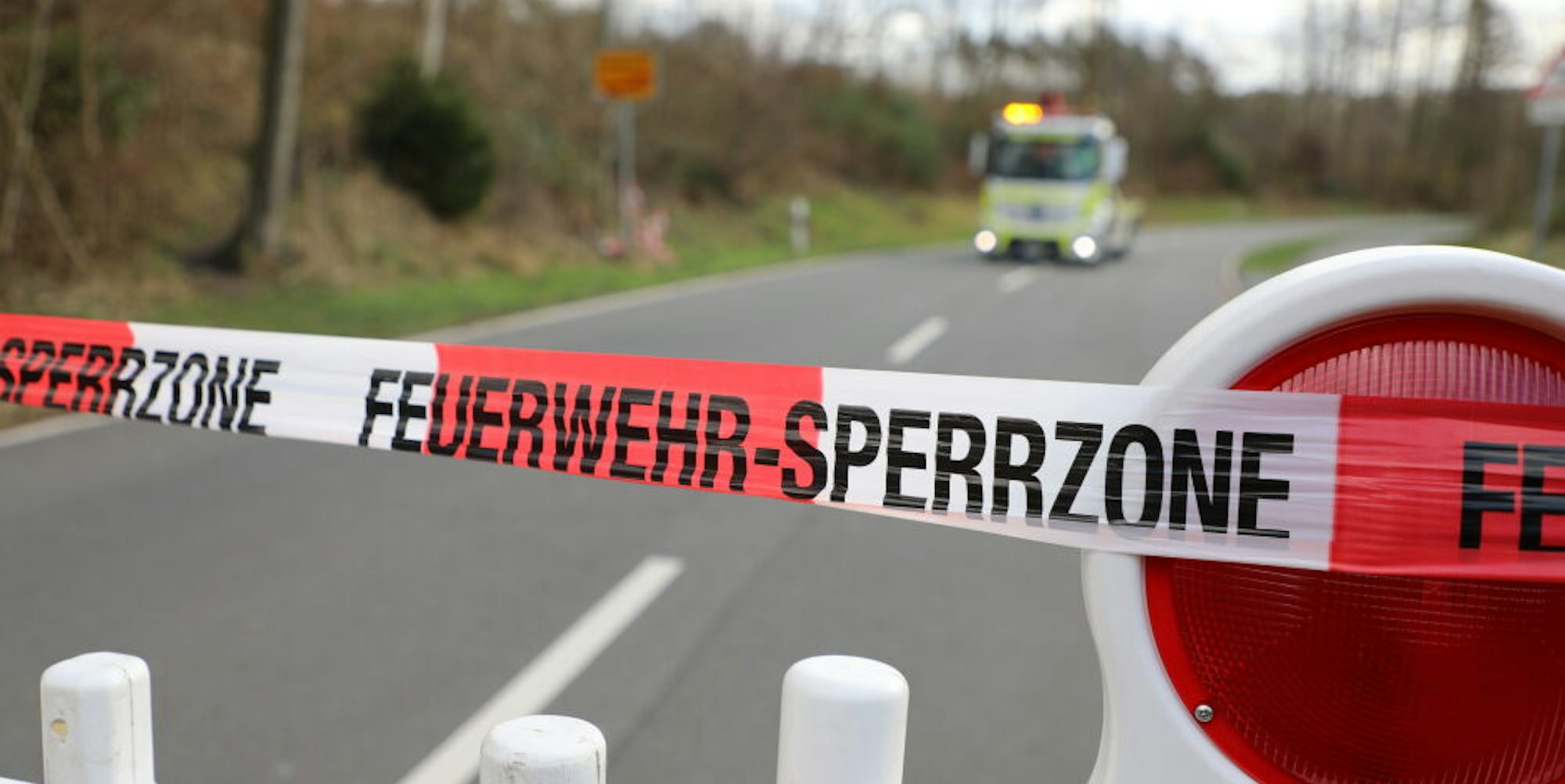 Feuerwehr-Sperrzone: Weiterhin gesperrt ist die Kreisstraße zwischen Bergisch Gladbach-Löhe und Overath-Immekeppel, weil dort weitere Bäume umzustürzen drohen.