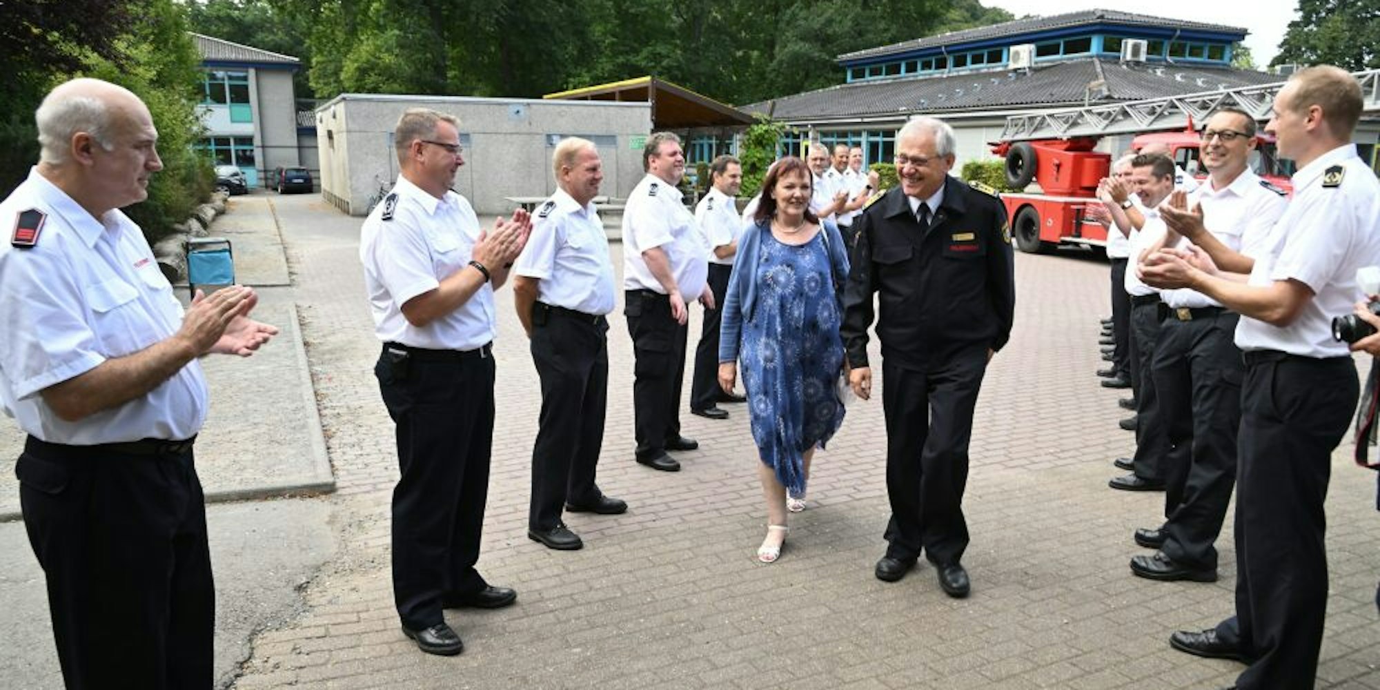 Die Feuerwehrchefs der Städte und Gemeinden des Kreises stehen Spalier für Rhein-Bergs Kreisbrandmeister Wolfgang Weiden und seine Frau Ute.