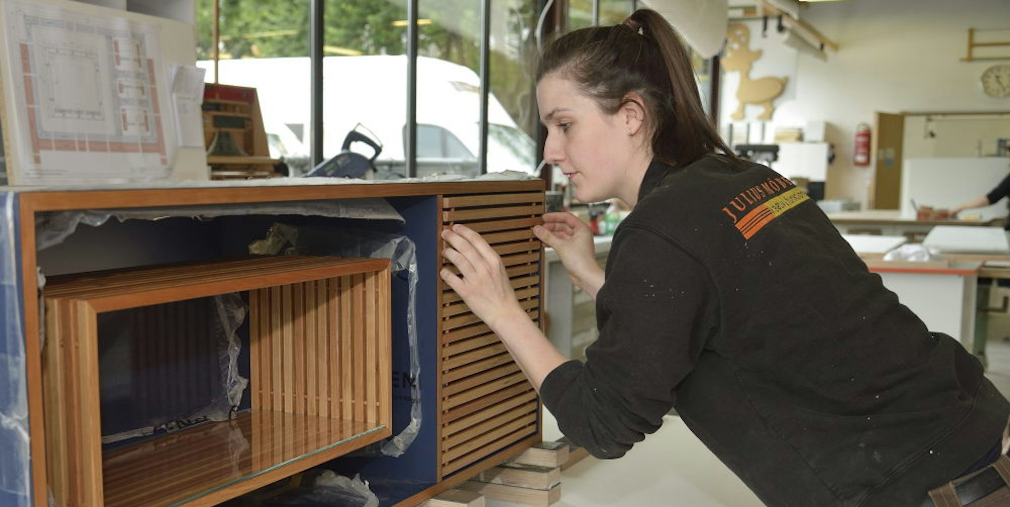 Rhein-Berg – Behutsam legt Korinna Rennefeld eine der filigran gestalteten Schubladenabdeckungen vor das Schubfach. Die schmalen Leisten aus amerikanischem Kirschbaumholz wirken leicht in ihren Händen. Kontrollblicke nach links und rechts, ein bisschen Staub an der Kante pustet sie schnell weg. Sanft drückt die 23-jährige Auszubildende die Abdeckung in die Öffnung, bis sie sitzt.
