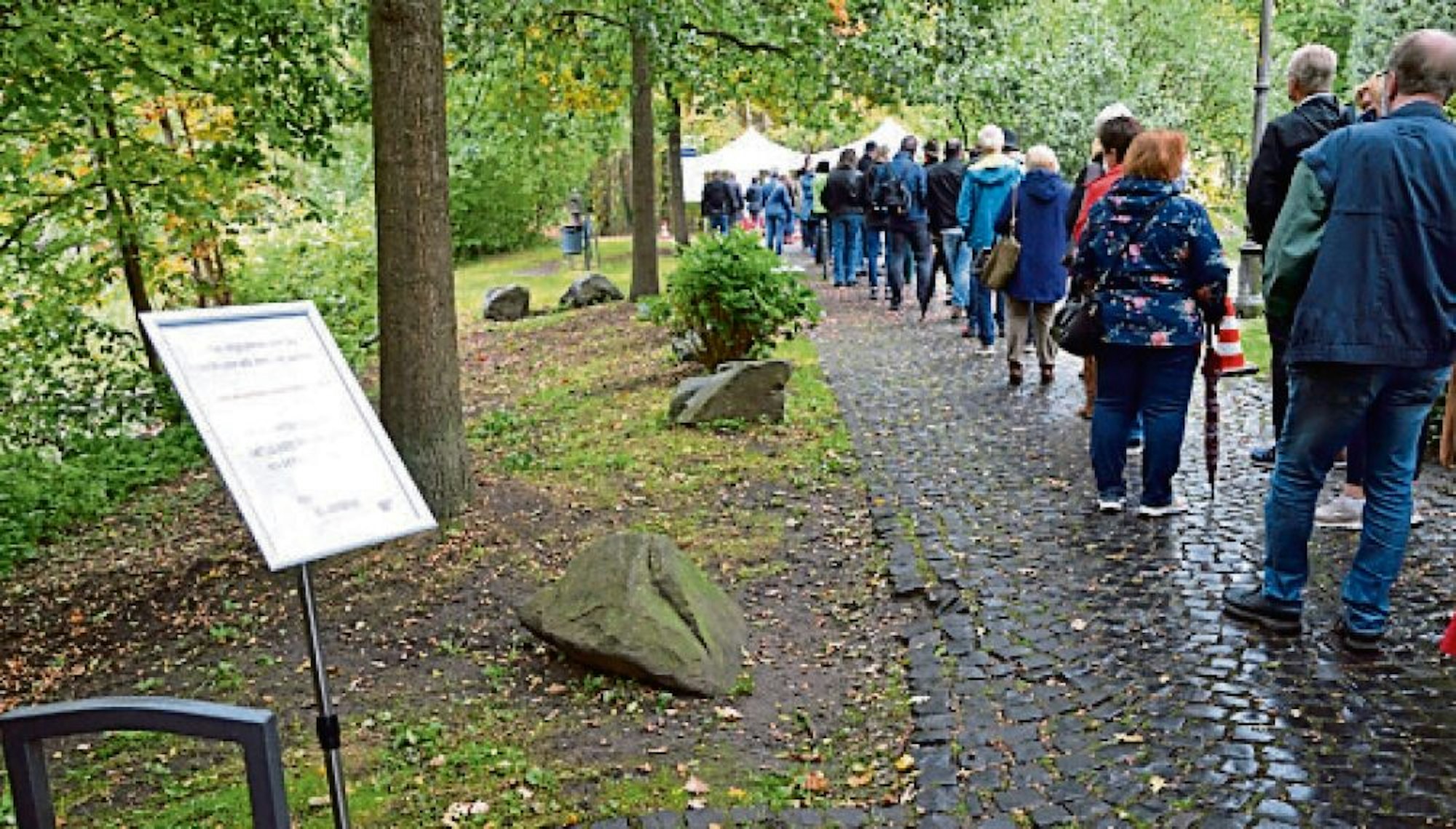 Rösrath – Schlange stehen war angesagt am Wochenende – vor der Torburg von Schloss Eulenbroich stehen sich schon um 9.15 Uhr die ersten Besucher die Beine in den Bauch bis zur Straße. Denn wer den Herbstmarkt besuchen will, muss sich zuerst registrieren und auf der Stirn Fieber messen lassen, dann die Hände desinfizieren und am besten gleich die Maske bereithalten.