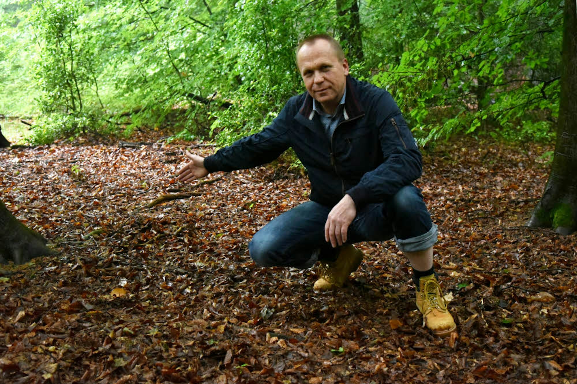 Ermittler Jens Tintenot deutet auf die Fundstelle der Leiche. Sie lag zwischen zwei Bäumen.