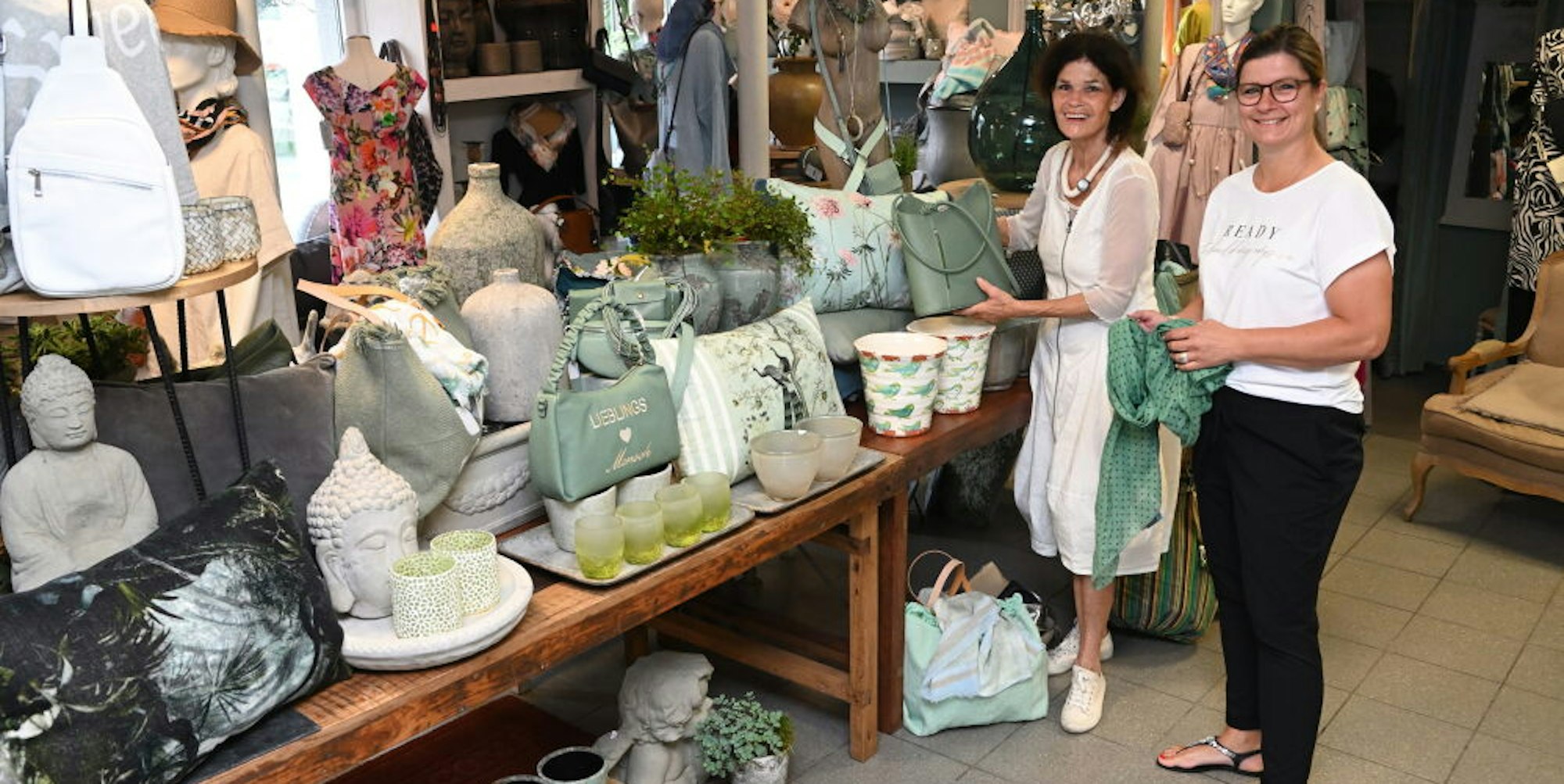 Die Corona-Pandemie war und ist auch für das Geschäft von Barbara Weiershausen eine schwierige Zeit. „Die Kunden wollen zu uns ins Ladenlokal kommen, die Ware sehen oder anprobieren. Das ist nun endlich wieder möglich.“ Entsprechend gefüllt sind zum Jubiläum die Regale und Ständer im Verkaufsraum. Alles farblich sortiert von Rot über Grün und Gelb bis zu Schwarz-Weiß, vom Kissen über Vasen, Blumen, Tücher und eine große Auswahl Sommerkleider.