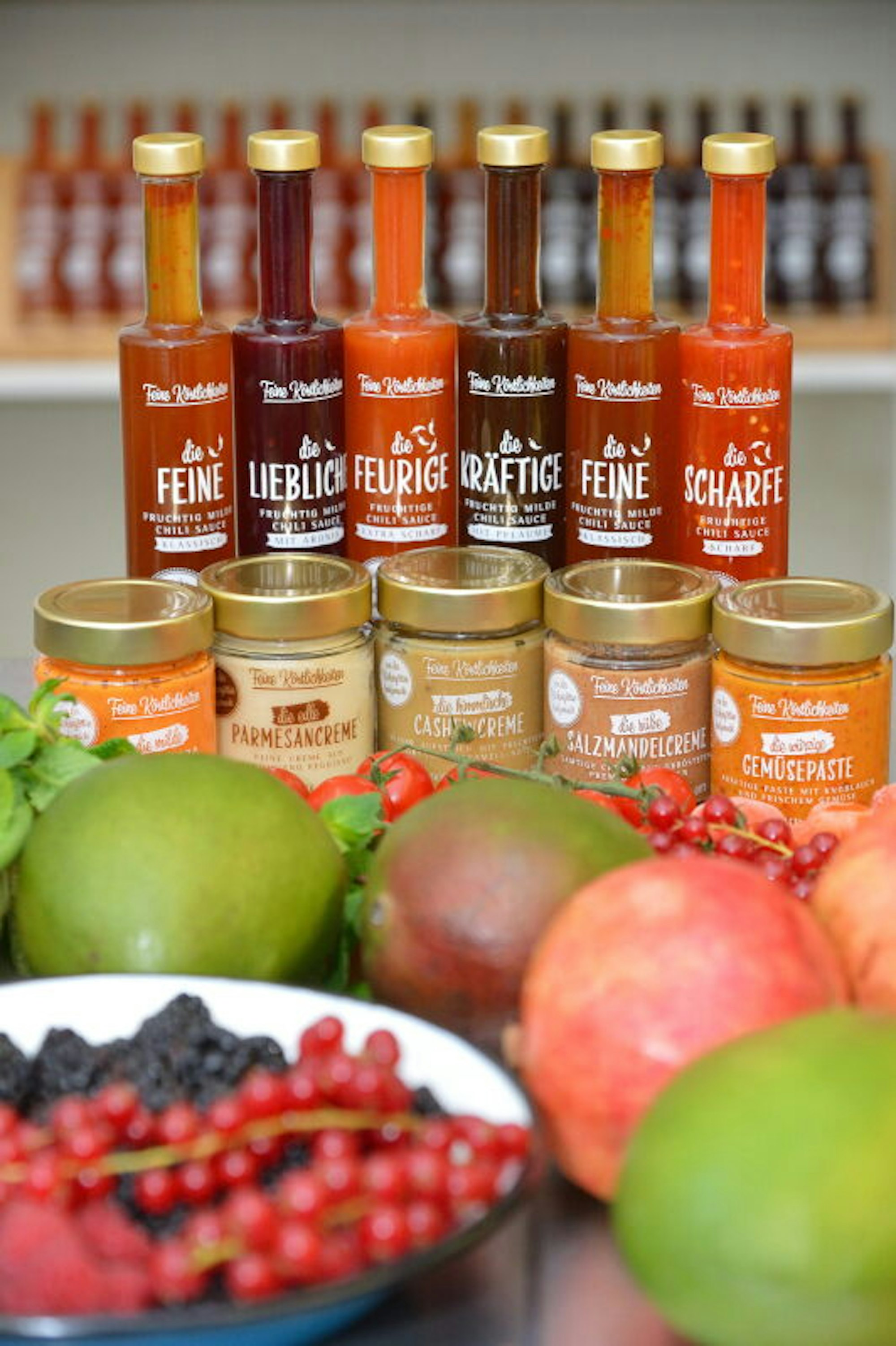 „Mit wenigen Zutaten etwas Gutes machen. Das habe ich von unserer Mutter gelernt“, sagt die Unternehmerin über ihre kreative Arbeit in der Küche. Wichtig sei natürlich eine hohe Qualität der Zutaten. Seit zwei Jahren vermarkten die Schwestern gemeinsam ihre handgemachten Gaumenfreuden ihres Unternehmens „Feine Köstlichkeiten“ in der neuen Produktionsstätte in Rösrath. Gegenüber von Schloss Eulenbroich an der Hauptstraße entstehen in einer rund 200 Quadratmeter großen Küche mit Lagerflächen besondere Cremes, Pasten und Chilisoßen.