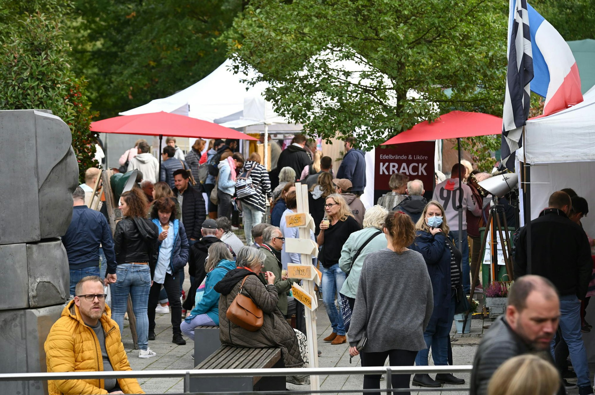Rösrath – Es fühlt sich wie ein Stück normales Leben an: Zum Herbstmarkt in Schloss Eulenbroich strömen die Menschen in Scharen, an den Verkaufsständen ist am Samstagnachmittag viel Betrieb, das Wetter spielt mit. Pandemie-bedingte Vorkehrungen sind getroffen, die Schloss Eulenbroich gGmbH hat aber für reibungslose Abläufe gesorgt: Der Eintrittskartenkauf am Eingang und die Kontrolle von Impfnachweis oder Corona-Test erfolgt an unterschiedlichen Ständen, mit ausreichend Personal, so bilden sich keine langen Schlangen. Im Freien sind Masken nicht vorgeschrieben, das fühlt sich entspannt an.