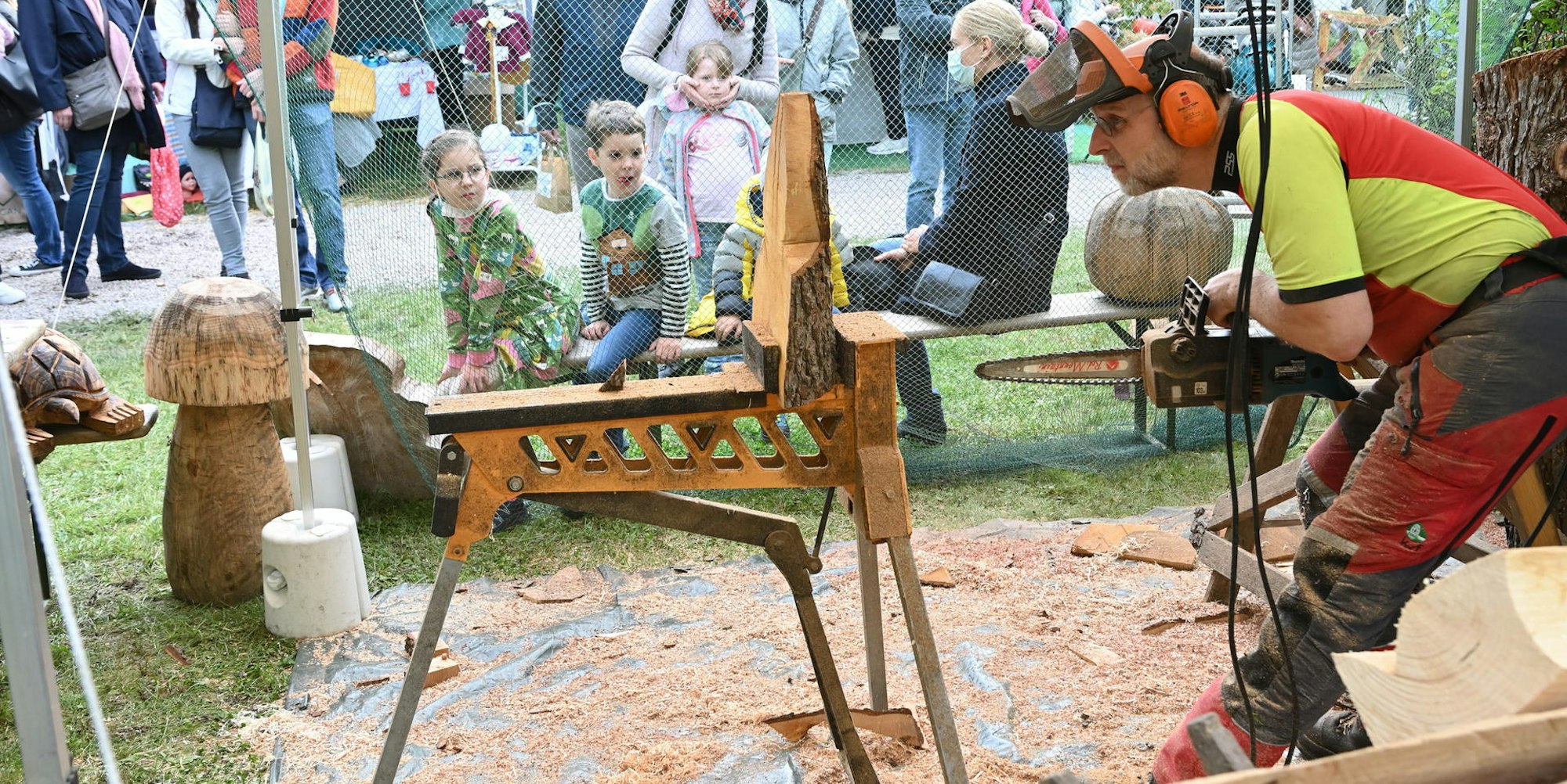Beim Schnitzen mit der Kettensäge konnten Erwachsene und Kinder auf der Schlosswiese zugucken, die Mädchen und Jungen machten große Augen.