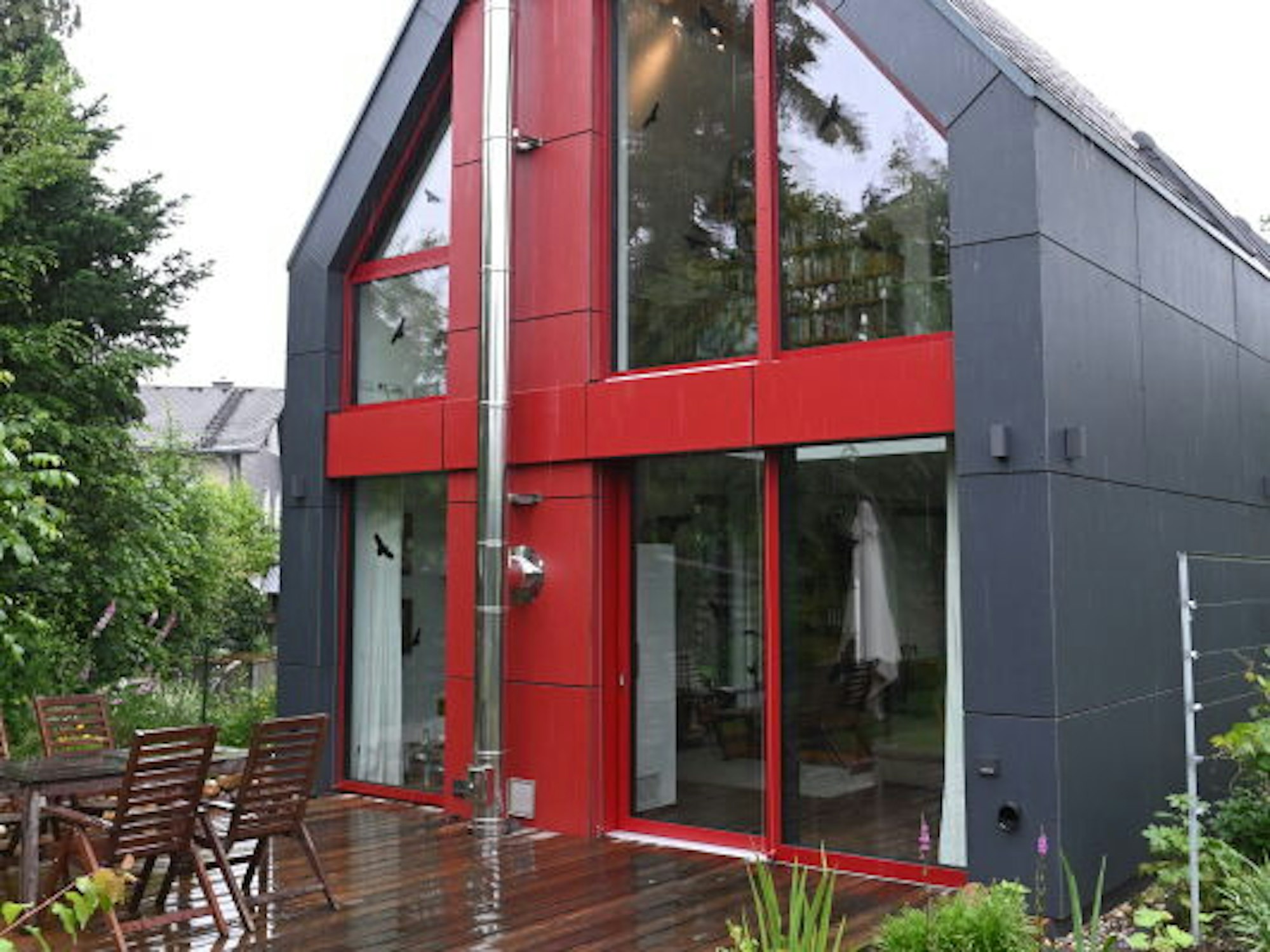 „Ich habe mich am Format der bestehenden Siedlungshäuser orientiert“, erklärt er zur äußeren Gestaltung des Hauses. Es habe die gleiche Dachneigung. Das Grau der meisten Außenflächen knüpfe an die traditionelle Schieferverkleidung im Bergischen an. „Ansonsten sollte das Haus möglichst einfach sein – so wie ein Kind ein Haus zeichnen würde.“ Auch wenn das Wohnhaus die Umgebung zitiert, so wirkt es doch modern und versteckt sich nicht, zu diesem Eindruck tragen die roten Faserzementplatten an der Fassade bei. Es ist aus Ziegeln und Beton gebaut, zudem sehr energieeffizient.