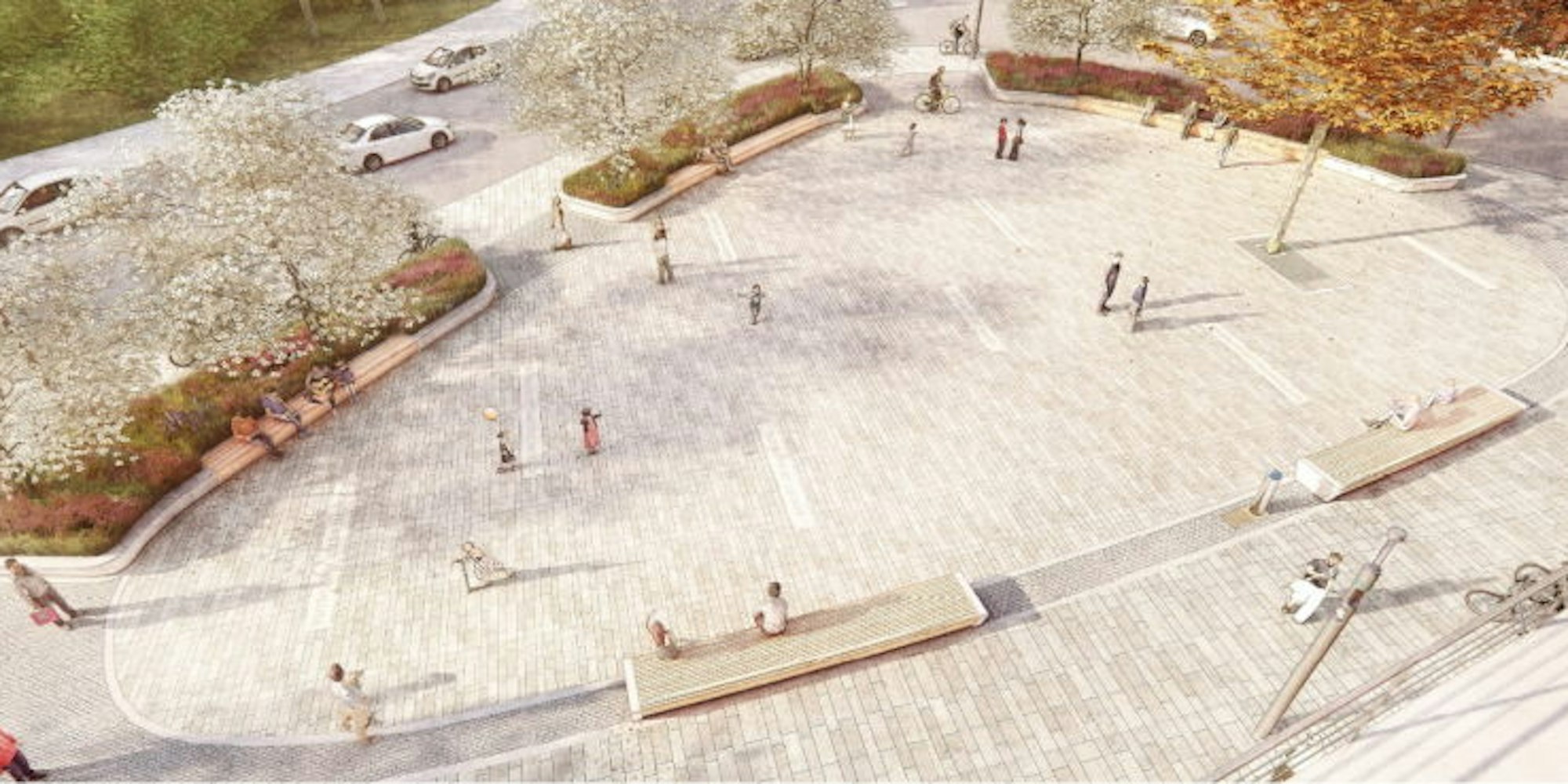 Der Entwurf des Landschaftsarchitekten-Büros „Greenbox“, der eine Jury mit Fachleuten und Politikern überzeugt hat und ab Herbst 2021 umgesetzt werden soll, folgt einer grundsätzlich anderen Logik als die der Kritiker: „Greenbox“ und die Jury halten den Platz heute für überfrachtet und wollen mehr Freiraum für Gestaltung schaffen, der Platz soll durchlässig sein und durch hochwertige Materialien wirken.