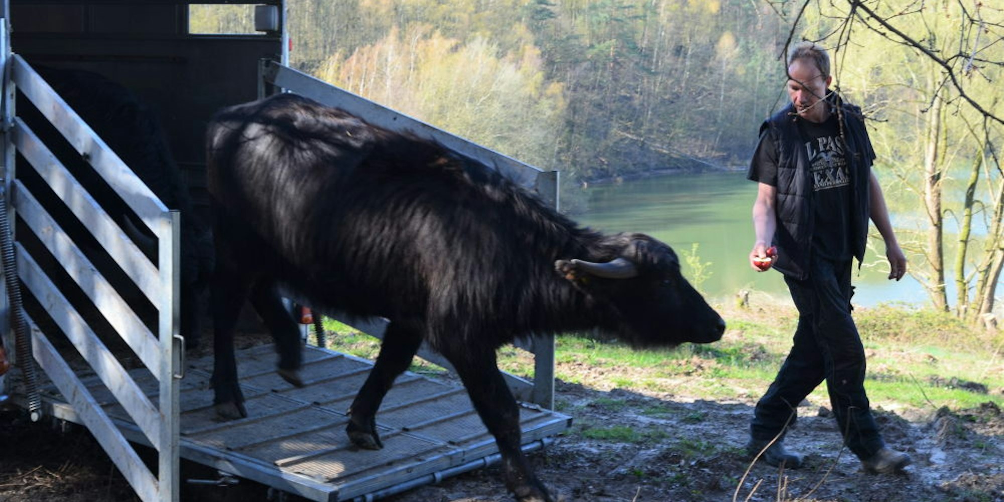 Sobald sich die namenlosen jungen Herren dort eingelebt haben, sollen die „Büffelis“, wie Broich und Dernerth die mächtigen Ochsen liebevoll nennen, Gesellschaft von einigen Galloways bekommen. Marcus Dernerth hat die beiden Büffel von Züchtern aus der Wahner Heide gekauft und zuvor ein wenig zahm gemacht. Mittlerweile frisst ihm das Duo buchstäblich aus der Hand, und eines der mächtigen Tiere legt sich bei seinen Besuchen ins Gras und hebt den Huf, um sich kraulen zu lassen. Für den Job im Auftrag der Stadt Köln und der Nabu Naturschutzstation Leverkusen / Köln ist das zwar egal, im Sinne der irgendwann anstehenden Fleischverwertung könnte die enge Bindung zum Besitzer indes durchaus lebensverlängernd wirken. Für einen geordneten Herdentrieb wäre es gut, wenn ein erfahrener Bulle auf dem Gelände bleibt, wenn Jungvieh dazukommt, überlegt Dernerth bereits.