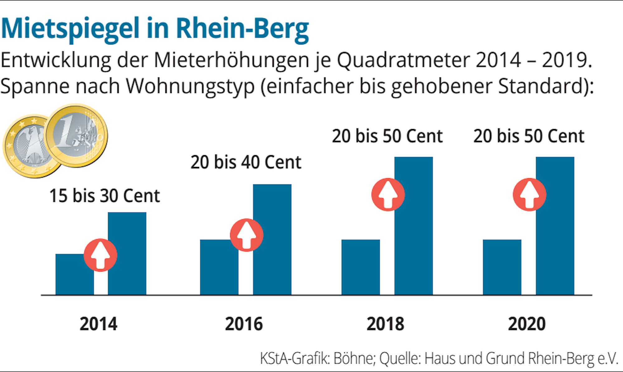 Diese Zahlen teilt der Verein Haus und Grund Rhein-Berg am Dienstag mit, der gemeinsam mit dem Mieterverein Köln und der Rheinischen Immobilienbörse den neuen Mietspiegel erstellt hat. Er gilt uneingeschränkt auch für Odenthal, Rösrath und Overath. Für die Gemeinde Kürten ist er unter Abzug eines 10-prozentigen Abschlags anwendbar. „Wir nähern uns dem Niveau der Kölner Mietpreise“, stellt Hans Jörg Depel, Geschäftsführer des Mietervereins Köln, fest. Die Menschen müssten einen immer größer werdenden Teil ihres Lohnes fürs Wohnen ausgeben.