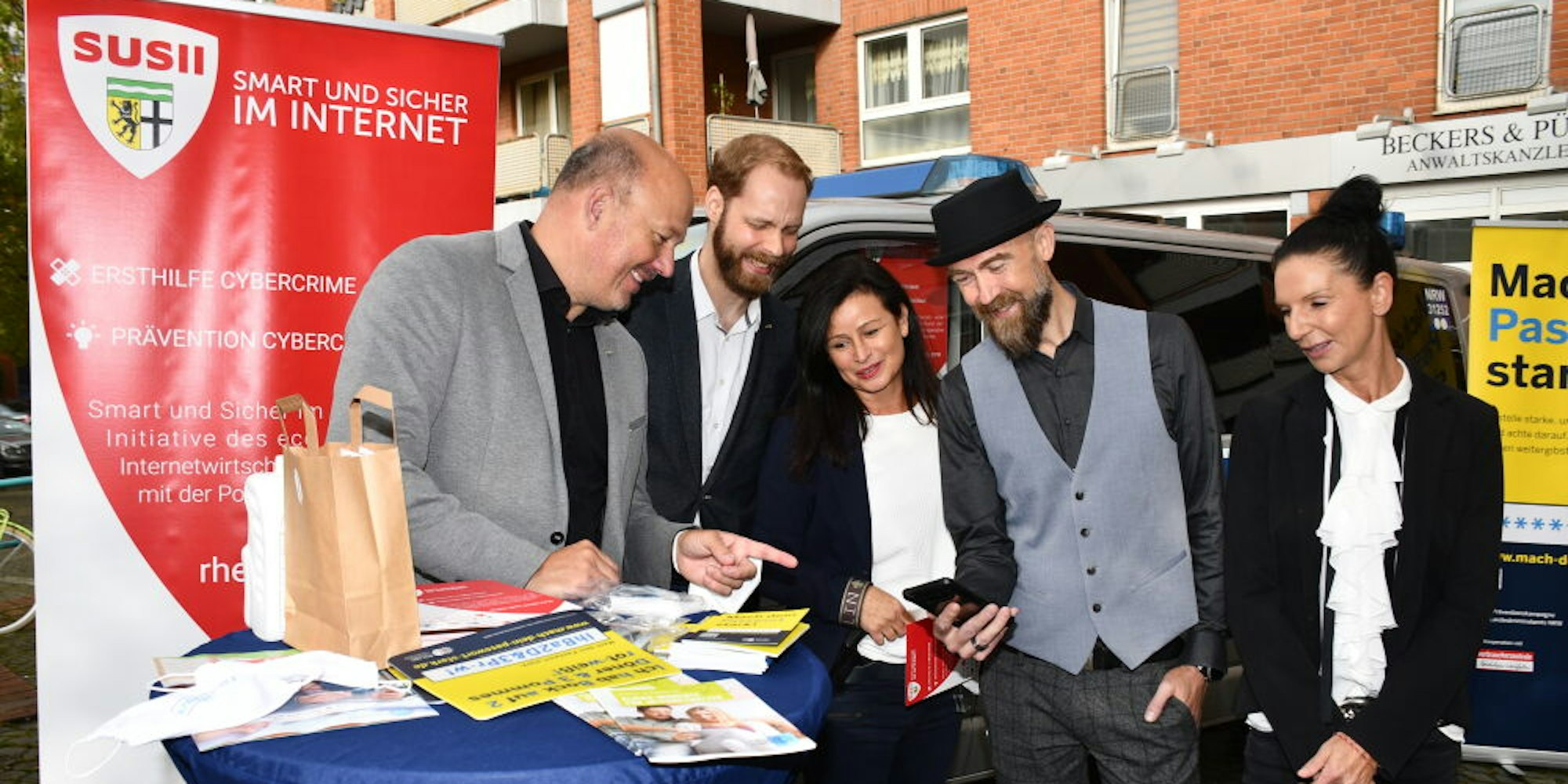 „Im Kampf gegen Cyberkriminelle helfen aus meiner Sicht nur zwei Dinge, nämlich Soforthilfe, wenn es gerade passiert ist, und Aufklärungsarbeit“, erklärte Landrat Frank Rock, der die Schirmherrschaft über SUSII übernommen hat, am Infostand auf dem Wochenmarkt vor dem Hürther Bürgerhaus.