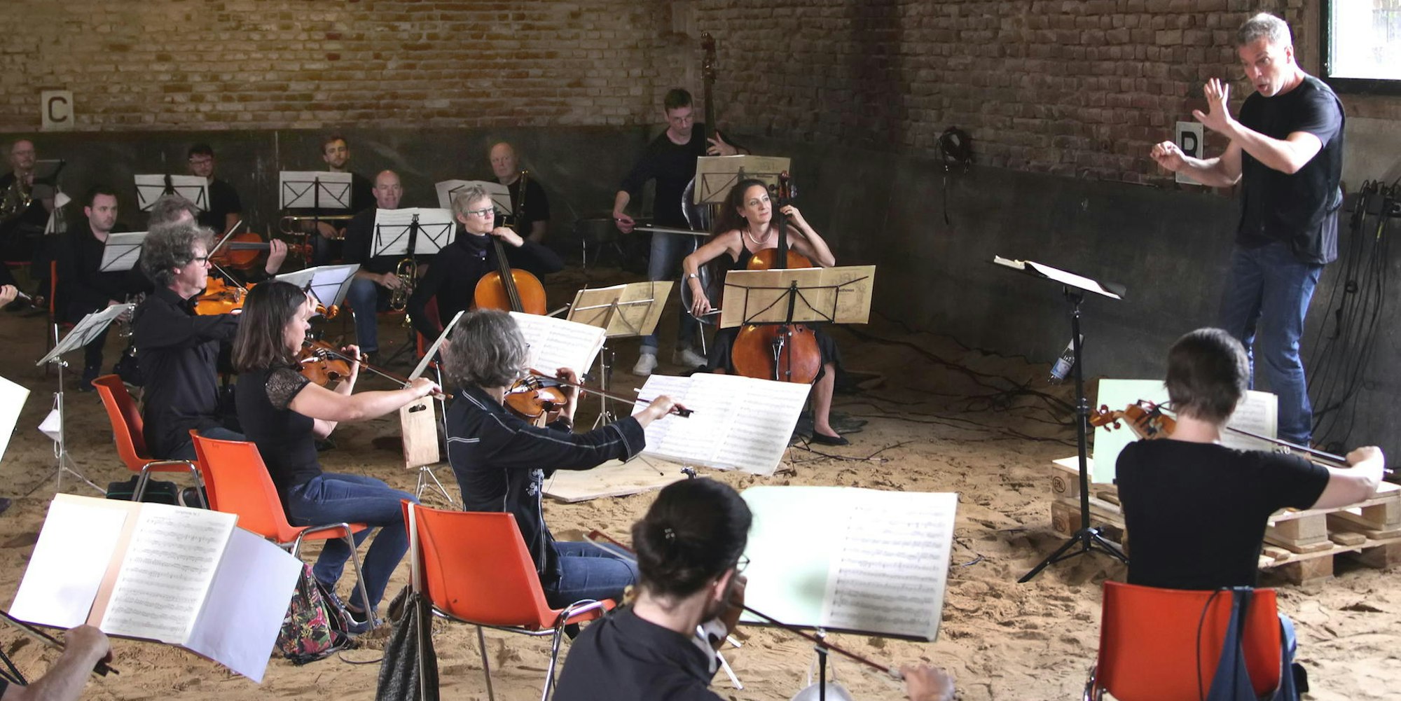 Während das 40-köpfige Hauptorchester in der inzwischen als Reithalle dienenden alten Scheune spielte, verteilten sich rund zwei Dutzend weitere Musikerinnen und Musiker, die über Kopfhörer mit dem Dirigenten verbunden waren, einzeln oder in kleinen Gruppen über das Anwesen.