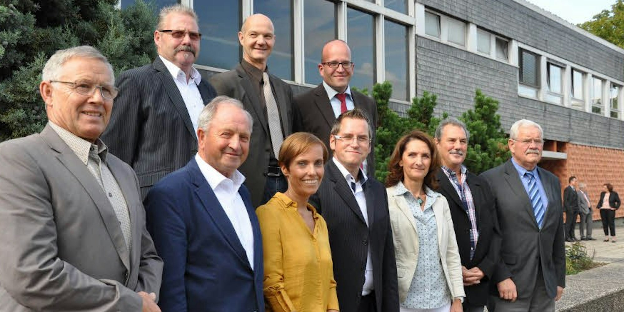 Die Ortsbürgermeister: (hinten v.l.) Herbert Förster, Peter Verse, Michael Lambertz sowie (vorne v.l.) Hubert Kraemer, Dieter Koehl, Nadine Heuser, Angelika Dreikhausen, Heinz-Gerd Horn und Helmut Breuer mit Bürgermeister Sascha Solbach (vorne M.).