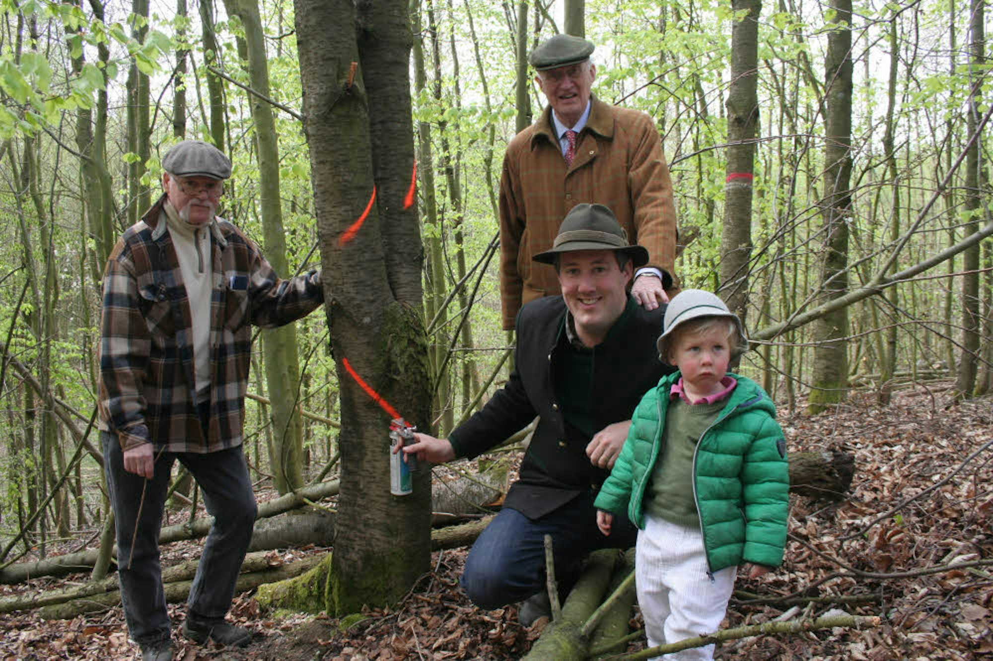 Naturschutzberater Rolf Thiemann (l.) begleitete Antonius, Clemens und Maximilian Graf von Mirbach-Harff (v. l.) im Wald des Hohenholzer Grabens.