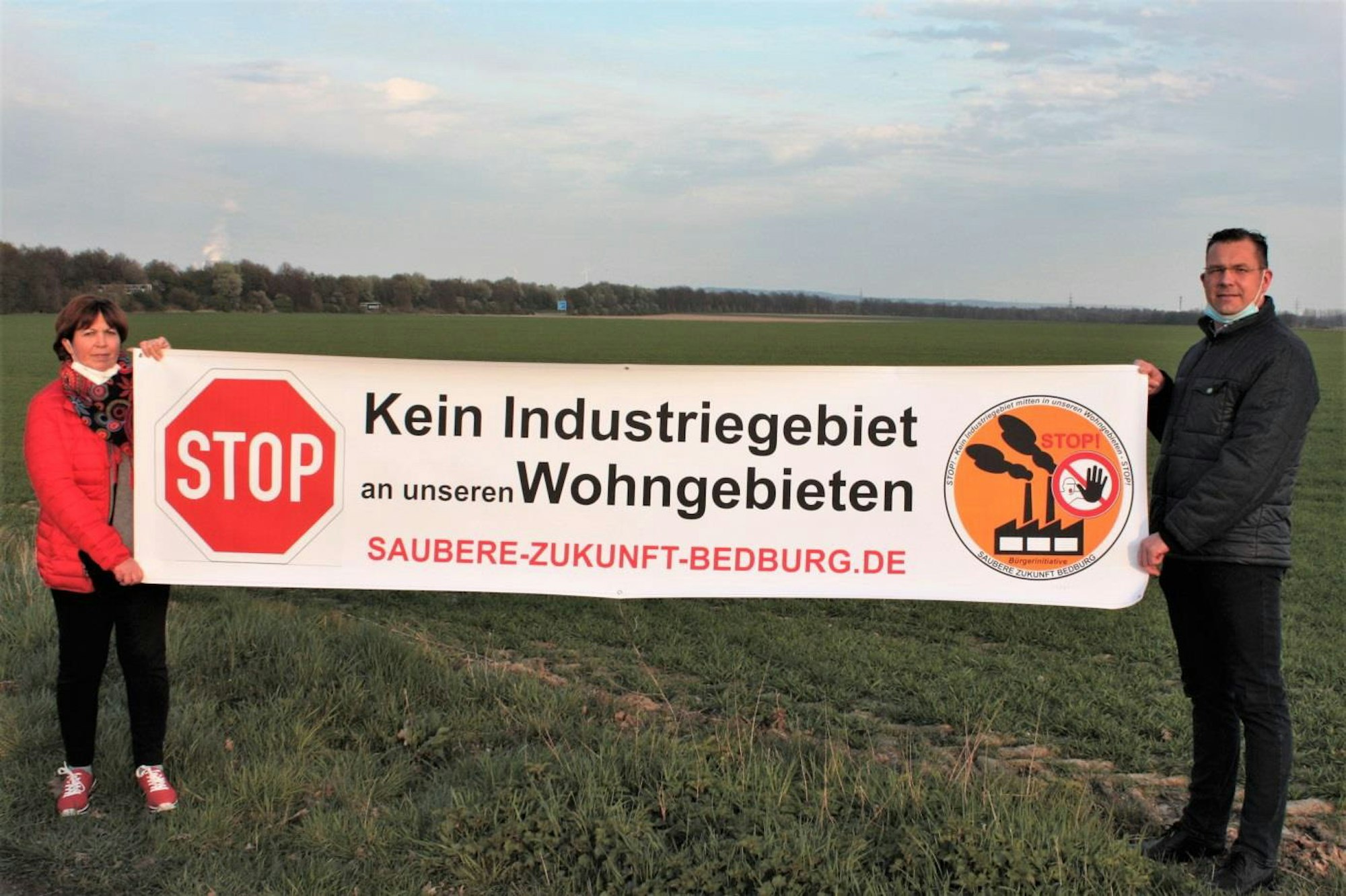 Elke Leone und Andreas Jobs von der Bürgerinitiative mit einem Protestplakat gegen das geplante Gewerbegebiet.