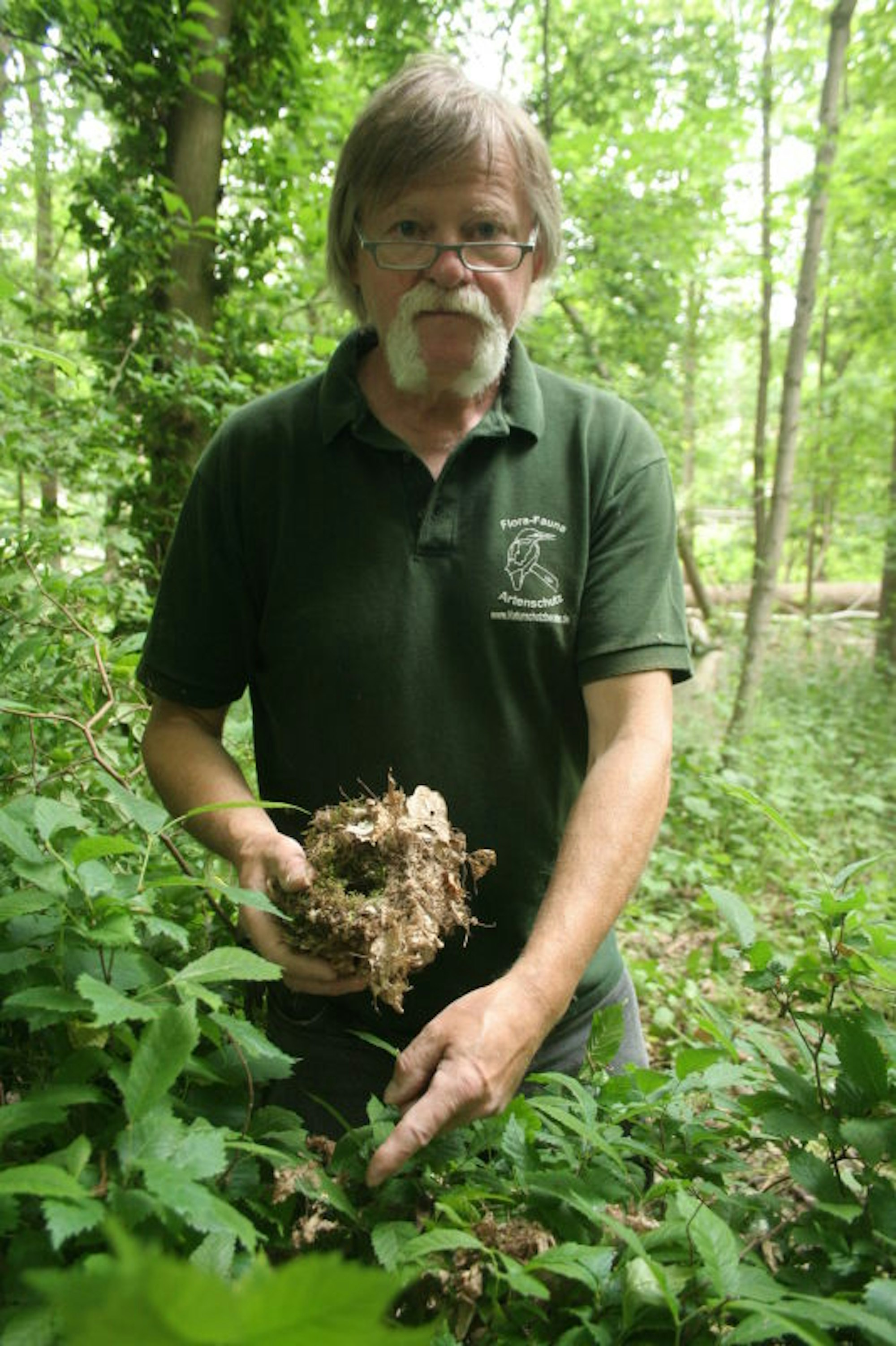 Rolf Thiemann und ein zurückgelassenes leeres Zaunkönignest.