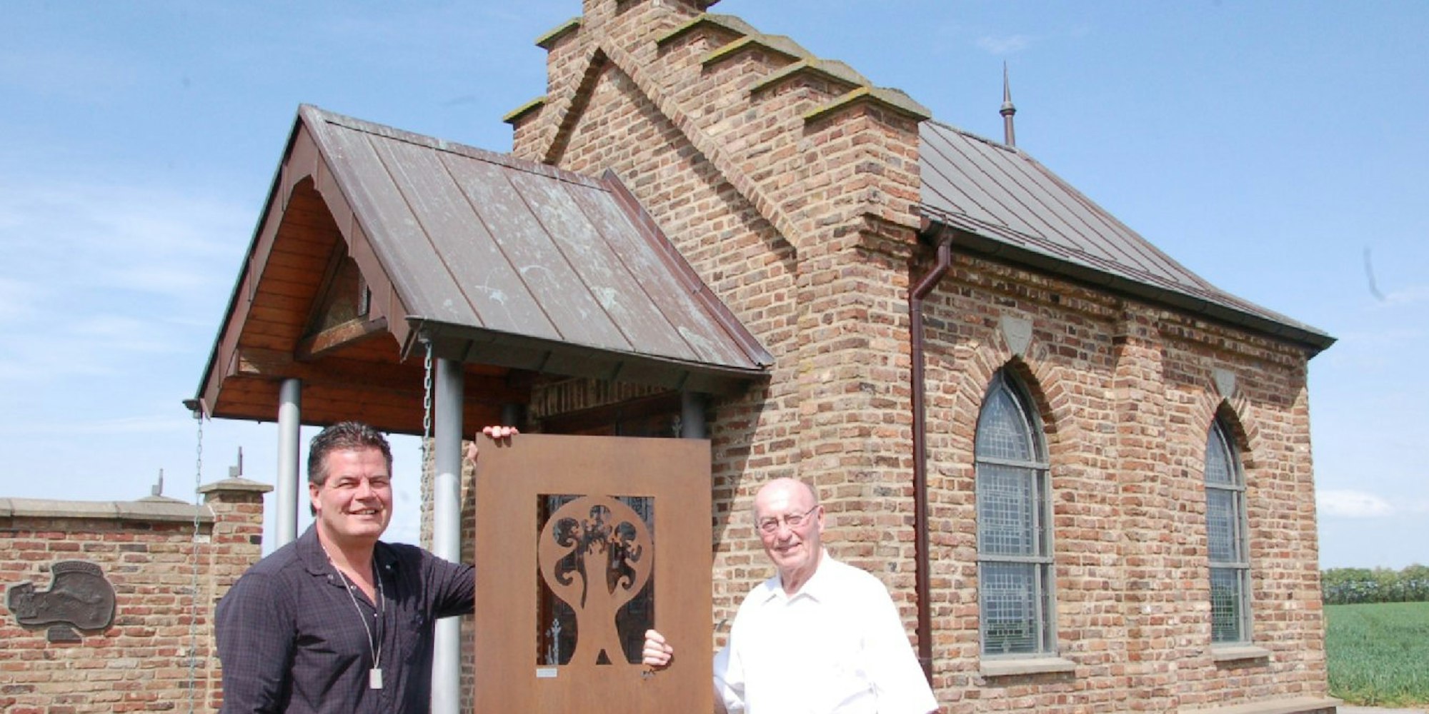 „Wir öffnen ein Fenster der Erinnerung“, erklärt Schröder, der in Königshoven zur Welt gekommen ist. Die erste Stele behandelt das Thema „Verlorenes Land“, die zweite behandelt die Verhandlungen, die dritte die anrückenden Bagger. Auf der vierten Stelle steht mit „Königshoffen“ der Name der alte Ortsbezeichnung. „Sie soll der Hoffnung auf das neue Zuhause Ausdruck verleihen“, betont der Künstler. Die Stahl-Stelen sind 1,80 Meter hoch, 60 Zentimeter breit und einen Zentimeter dick. Die verbliebenen drei Kunstwerke behandeln die Bereiche „Neue Heimat“, „Umzug“ und „Neues Land“. Wer den Stelen auf seiner Wanderung künftig folgen wird, läuft dabei durch die Rekultivierung im ehemaligen Tagebau Garzweiler über die Königshovener Höhe bis zur Kapelle. „Die Petrus-Kapelle befindet sich dort, wo einst das Alte Königshoven stand“, betont der Ortsbürgermeister. Künstler Schröder ist im Ort kein Unbekannter. So hat er den stählernen Engel, der gleich neben der Kapelle steht, ebenfalls entworfen.