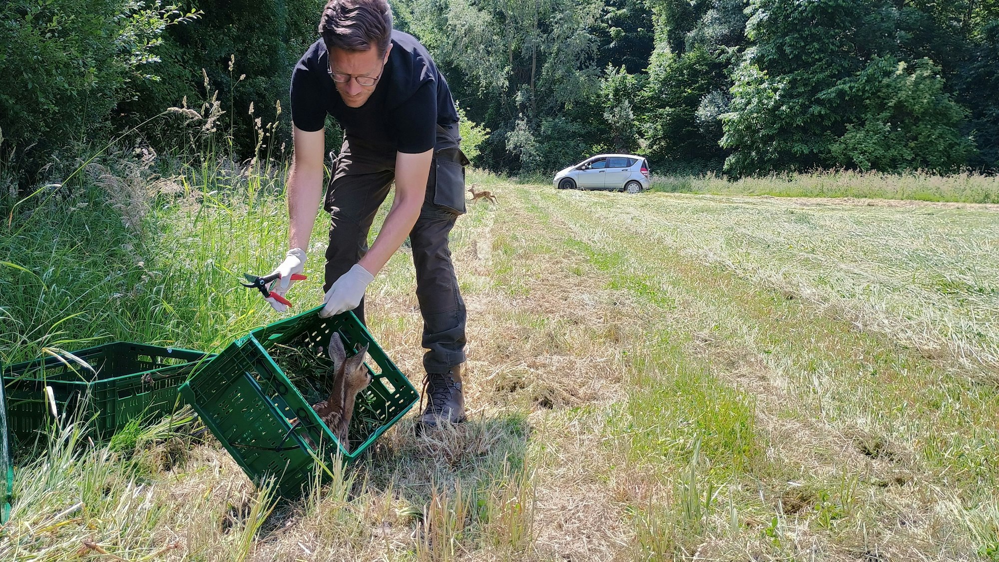 Die Notwendigkeit der Rettungsaktion ist ersichtlich, als die ehrenamtlichen Tierretter Michael Vormann, Lukas Schiefer und Jäger Andreas Kersting die Boxen öffnen, um die Kitze wieder freizulassen. Sie müssen die Boxen kippen, damit die Tiere sie verlassen, und selbst dann ergreifen zwei von ihnen nicht die Flucht, sondern plumpsen schlichtweg auf das Gras und bleiben dort sitzen.