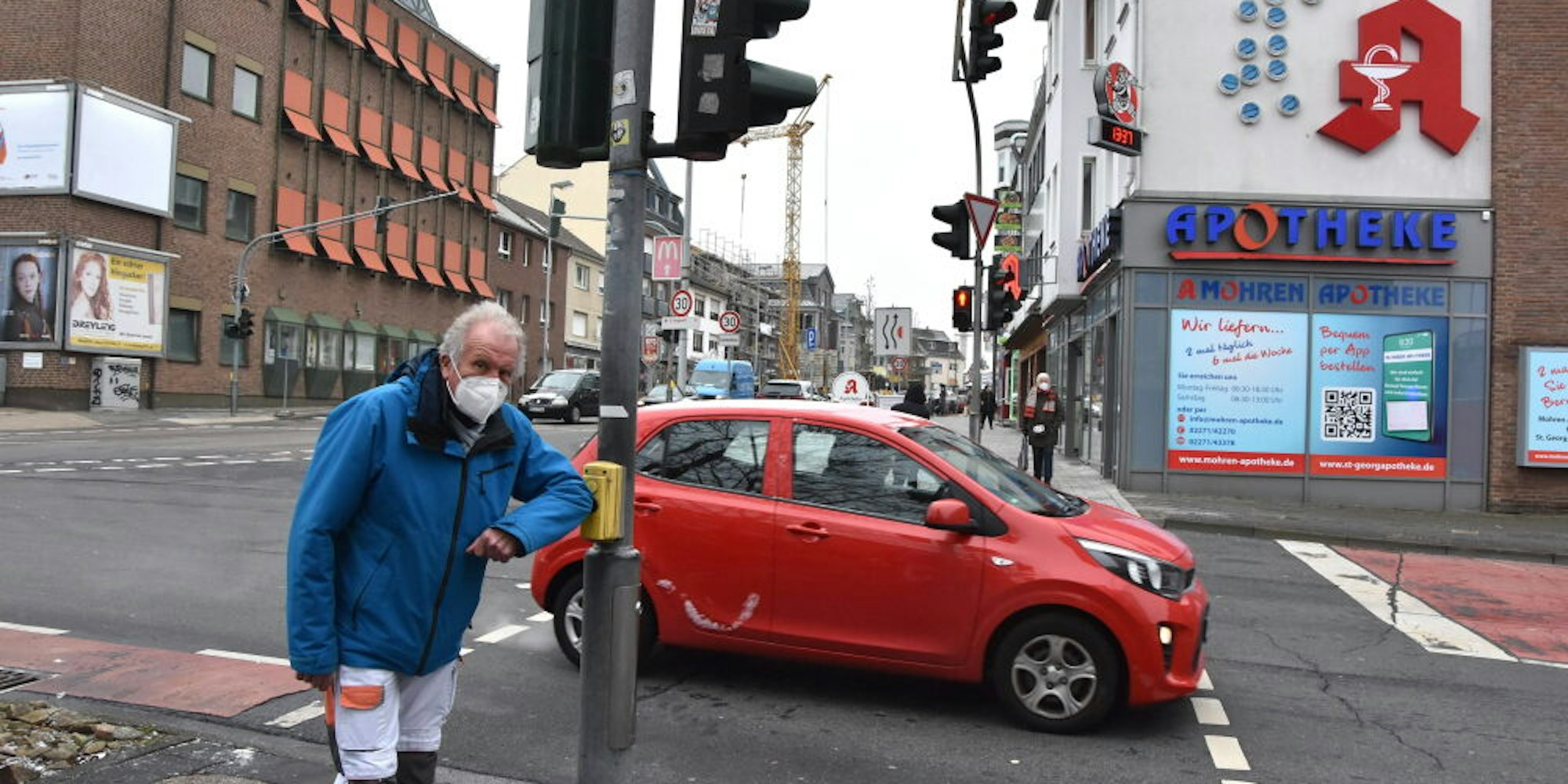 Herman-Josef Falterbaum (CDU) hatte sich des Problems angenommen und sich unter anderem in Düsseldorf und Euskirchen schlau gemacht, wie es auch anders, ohne Ansteckungsgefahr oder Verrenkungen, gehen kann. In der Landeshauptstadt wird seit November ein System getestet, bei dem Radartechnologie erkennt, dass ein Fußgänger auf Grün wartet und dann die Ampelschaltung auslöst. Er hat die Verwaltung gebeten, solche Technik an der Innenstadtkreuzung zu testen.