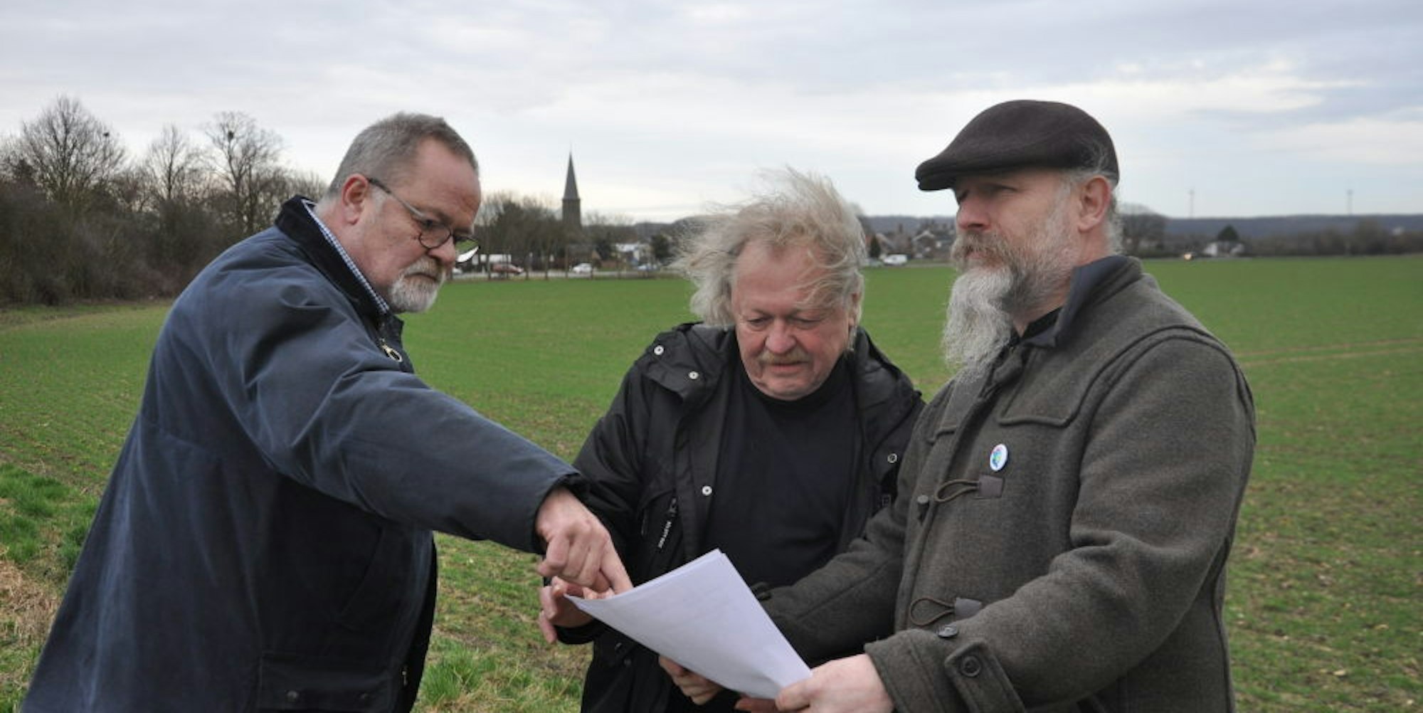 Die Karten über mögliche Kiesabbaufelder bei Thorr studieren (v.l.) Thomas Roos, Horst Lambertz und Peter Hirseler.