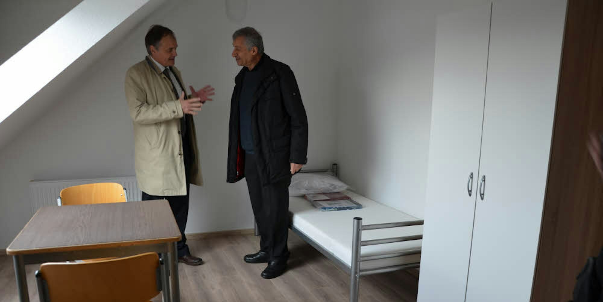 Bett, Tisch, Schrank: Die Einrichtung in den neuen Flüchtlingshäusern ist solide, doch keineswegs luxuriös. Klaus-Hermann Rössler und George Khoury führten durch einen der zehn Neubauten.