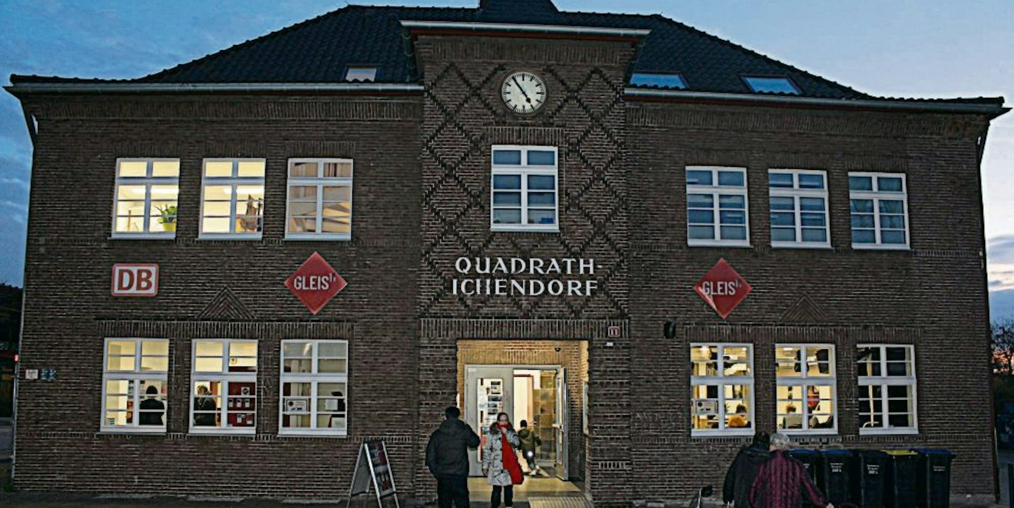 Das Bahnhofsgebäude in Quadrath-Ichendorf aus Backstein wurde 1928 gebaut. Aus diesem Jahr stammt auch die Uhr.