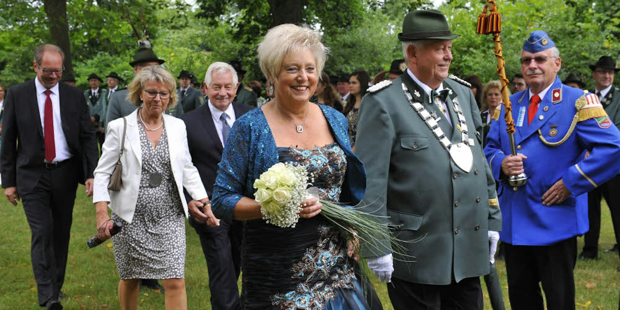 Mit seiner Frau Inge, der Bürgerkönigin Ulrike Scheeren-Bechhold und ihrem Mann Dieter sowie Bürgermeister Volker Mießeler marschierte Junggeburth am Sonntag die Reihe der Gäste ab. Schützen aus Zieverich, Grouven und Thorr waren dabei, die Kentener Maibuben und die Freiwilligen des Löschzuges Kenten repräsentierten die Ortsvereine. (otr)