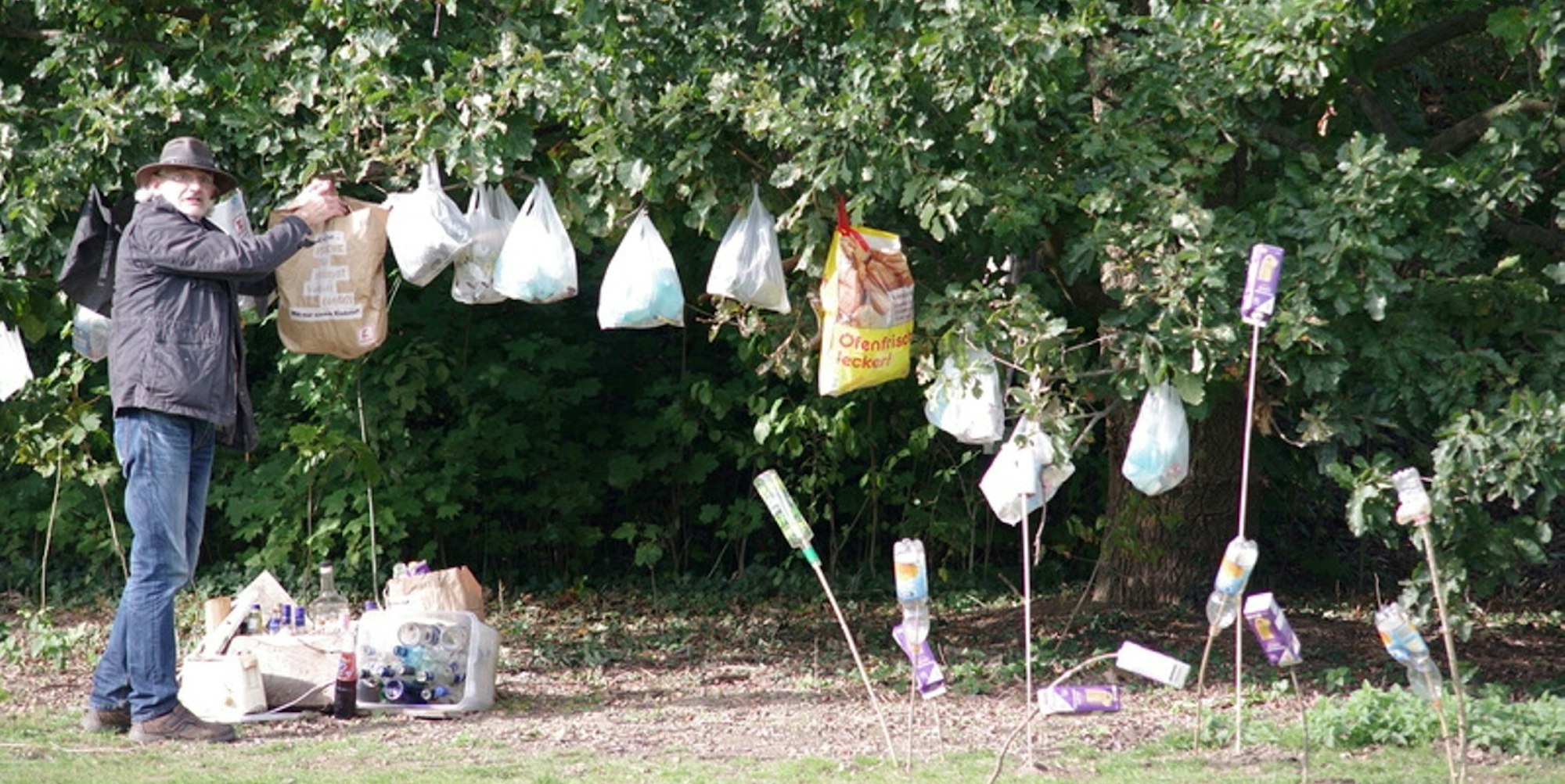 Bergheim – Dieses Mal war es zu viel, sagt Peter Wittig. Zwölf Flaschen Wodka zählte der Bergheimer am vergangenen Samstag auf der Grünfläche der Grünen Lunge, dazu noch jede Menge anderen Abfall. „Die ganze Wiese war voll mit Flaschen und Bechern.“ So viel, dass Wittig damit mehrere Tüten füllen konnte. Die hat er dann in der Grünen Lunge aufgehängt, „um darauf aufmerksam zu machen.“ Dazu hat er die leeren Flaschen auf Stöcken in die Erde gesteckt – ein bizarres Kunstwerk.