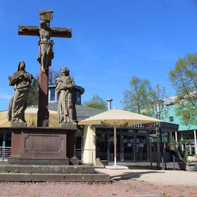 Der Sockel des Kalvarienbergs an der kleinen Erft in der Innenstadt wird abgebaut.