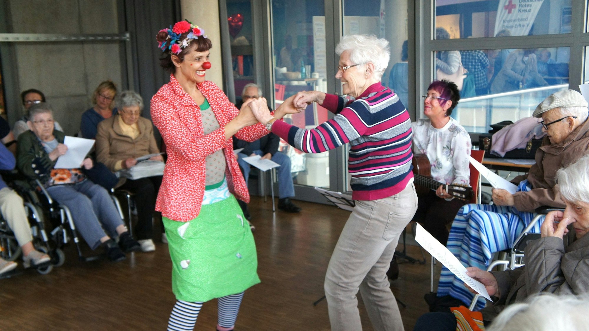 Demenz einfach wegtanzen: Bei einer Mitmachaktion der Lokalen Allianz zaubert Clown Frieda den Anwesenden ein Lächeln ins Gesicht.
