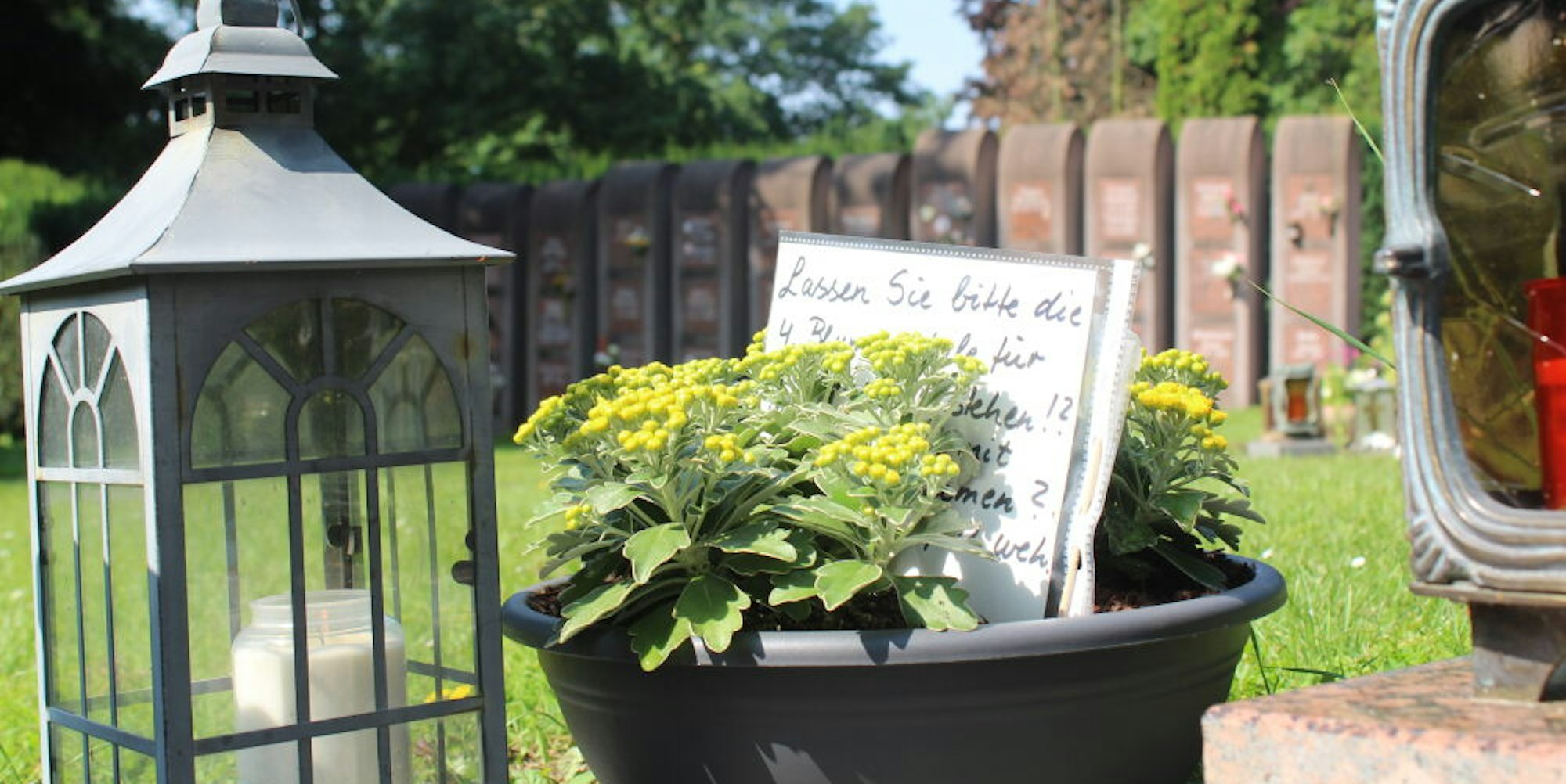 Der Mann der 78-Jährigen ist in den Stelen des Friedhofs an St. Remigius begraben. Davor gibt es eine gepflasterte Fläche, an deren Rand Laternen und allerhand Grabschmuck der Angehörigen platziert sind. An einer Ecke steht die nun vierte Schale von Elke Derkum mit gelben Blumen darin.