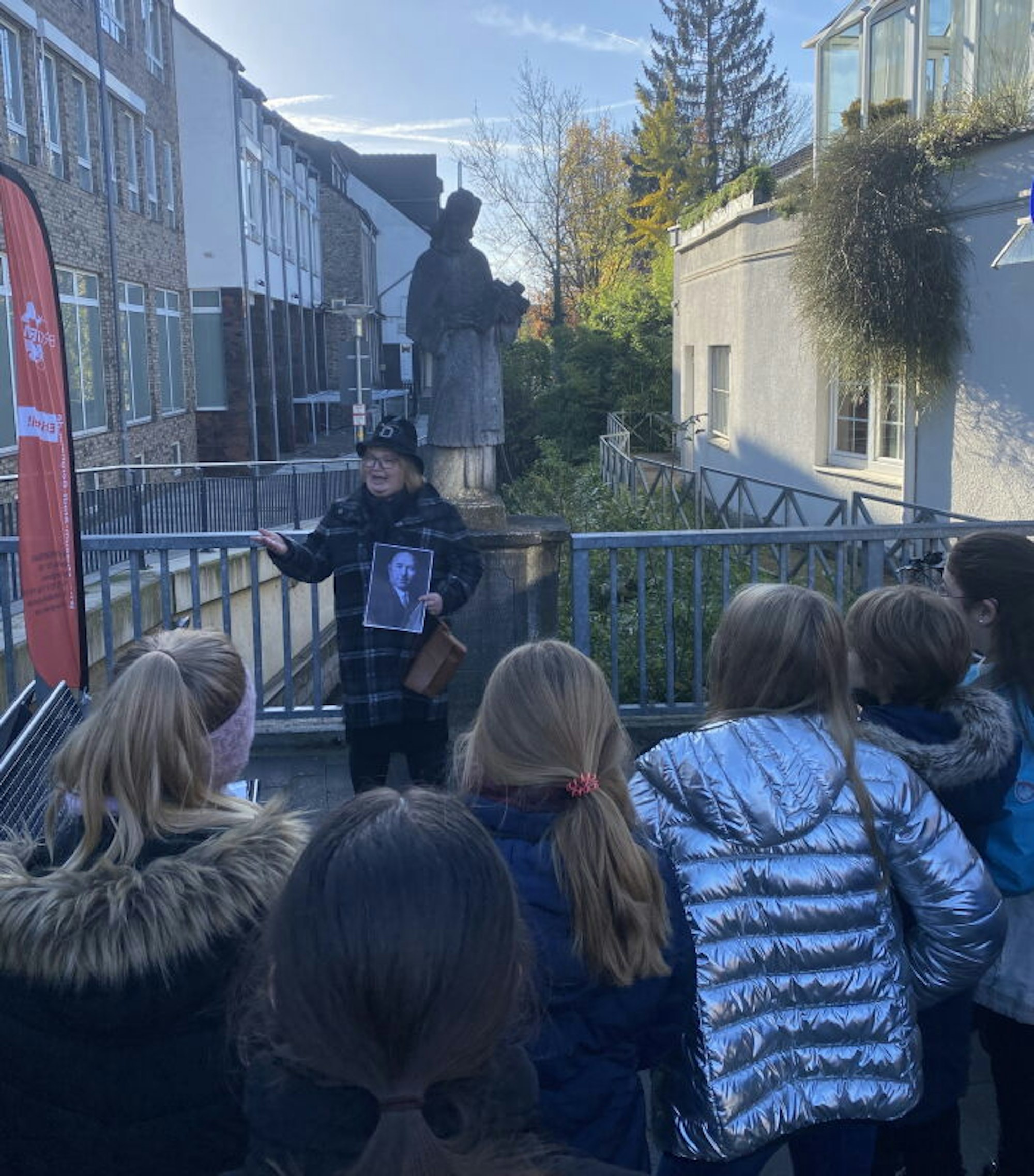 In der Nähe des Krankenhauses zeigte er den Schülerinnen und Schülern, wo sich bis 1939 die Synagoge der jüdischen Gemeinde Bergheim befand. An der Erftbrücke stand derweil schon Frau Schmitz, alias Astrid Machuj, bereit. Als Frau Schmitz von ihrer Angst erzählte, weil ihr Mann drei Juden im Haus versteckt und sich häufiger gegen die SS gestellt habe, hörten die Kinder ihr gespannt zu.