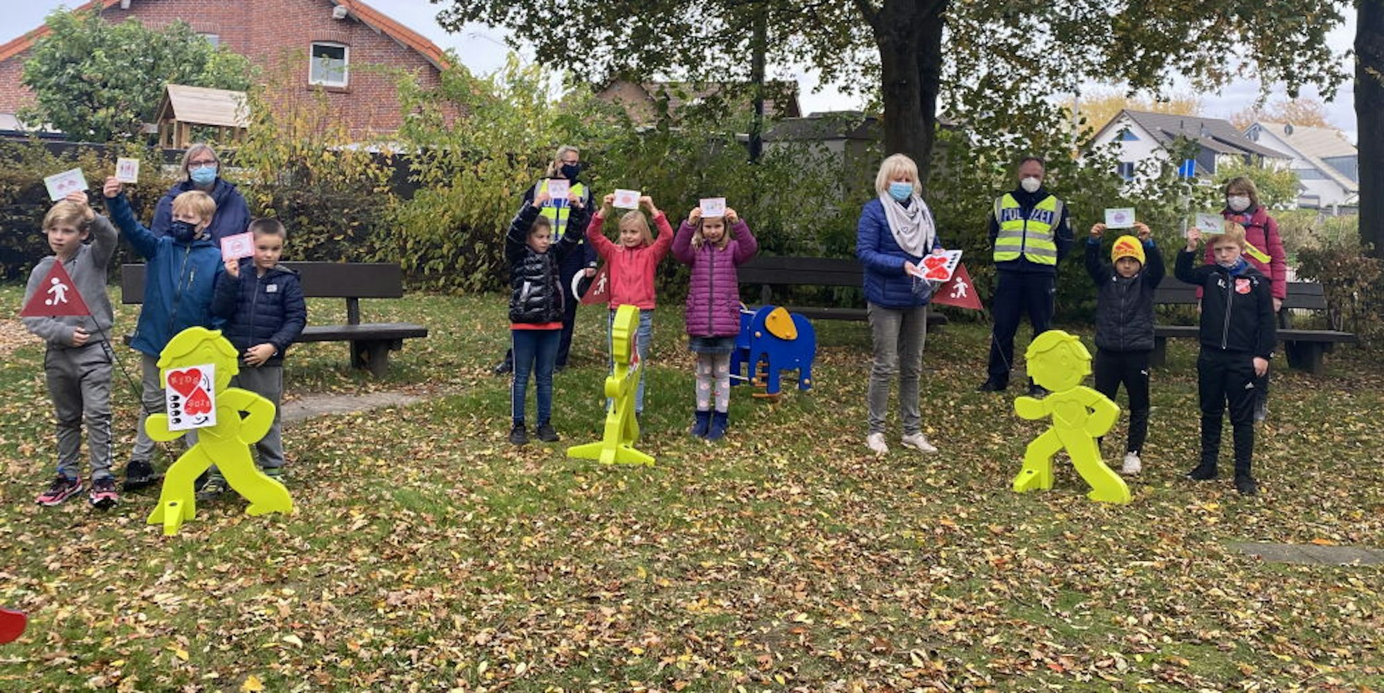 „Ihr dürft hier überall spielen und die Fußgänger die Straße in ihrer ganzen Breite nutzen. Die Autofahrer müssen Rücksicht nehmen und beim Fahren die Schrittgeschwindigkeit einhalten“, erklärte Polizeihauptkommissar Ehlert. „Ich finde es sehr wichtig, dass die Figuren vor dem Winter stehen, da es nun wieder so früh dunkel ist und die Autofahrer noch aufmerksamer sein müssen“, kommentierte die Schulleiterin der Rochusschule, Astrid Kleine, die Aktion.