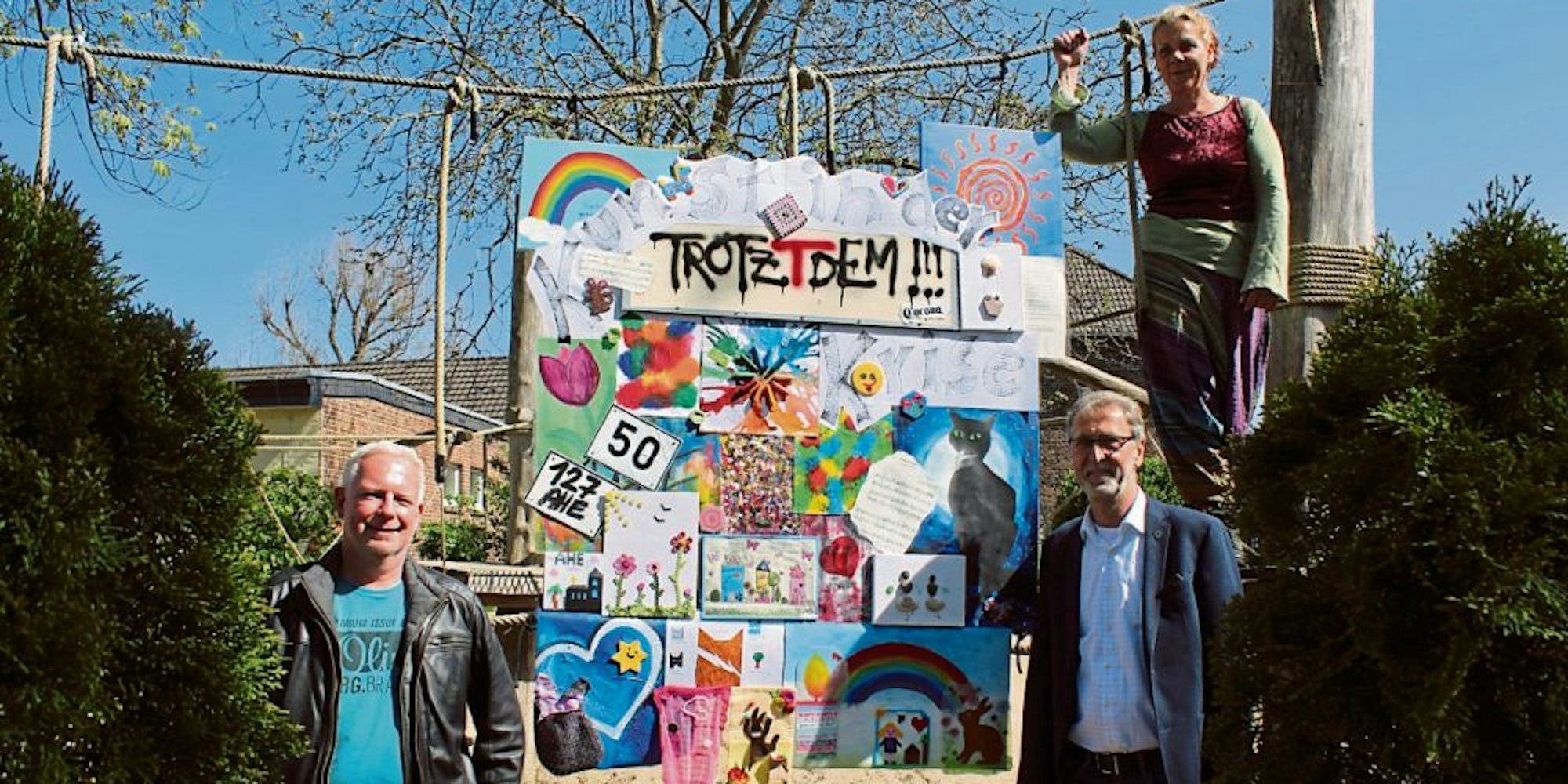 Das Trio stellte jetzt auf dem Kindergartengelände das Ergebnis einer Kunstaktion vor, an der sich rund 50 Menschen beteiligt hatten. Birgit Kaufmann (50) betreibt in Ahe eine Malschule und hatte die Idee dazu. „Ich kann gerade keine Kurse geben, und da dachte ich mir: Kreativ sein lenkt ab und macht Spaß.“ Deshalb startete sie über Facebook einen Aufruf. Jeder konnte ein Kunstwerk beisteuern. Material und Technik waren egal, Hauptsache, das Werk war nicht größer als ein Din-A-4-Blatt. An ihrem Haus platzierte Kaufmann ein Körbchen, in das die Teilnehmer ihr Bild ablegen konnten. Kaufmann hat die Einsendungen dann mit Hilfe von Jens Lemmer zusammengesetzt.