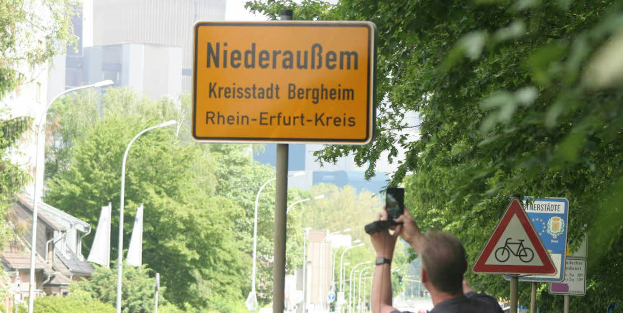 Bergheim – So mancher Spaziergänger und Autofahrer rieb sich verwundert die Augen: Der Bergheimer Stadtteil Niederaußem liegt im „Rhein-Erfurt-Kreis“, behauptet das neue Schild am Ortseingang an der B 477. Nun liegen aber zwischen Bergheim und der thüringischen Hauptstadt Erfurt schlappe 400 Kilometer. Oder dachte der Schildermacher vielleicht an eine Furt in der Erft?