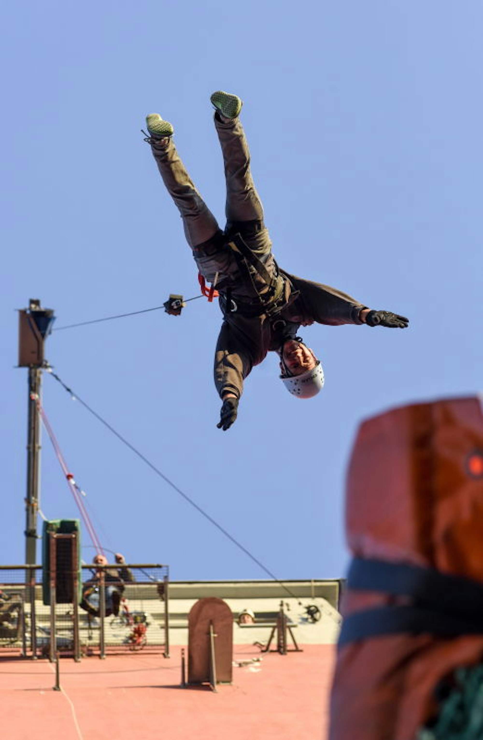 Auch der stellvertretende Bürgermeister Robert Saß stürzte sich in die Tiefe, zum ersten Mal: „Der aufregendste Moment war, als ich auf die Plattform hinausgetreten bin und den Blick runter gewagt habe. Ein paar Sekunden hängt man dann noch am Haken. Der Fall selbst ist toll.“