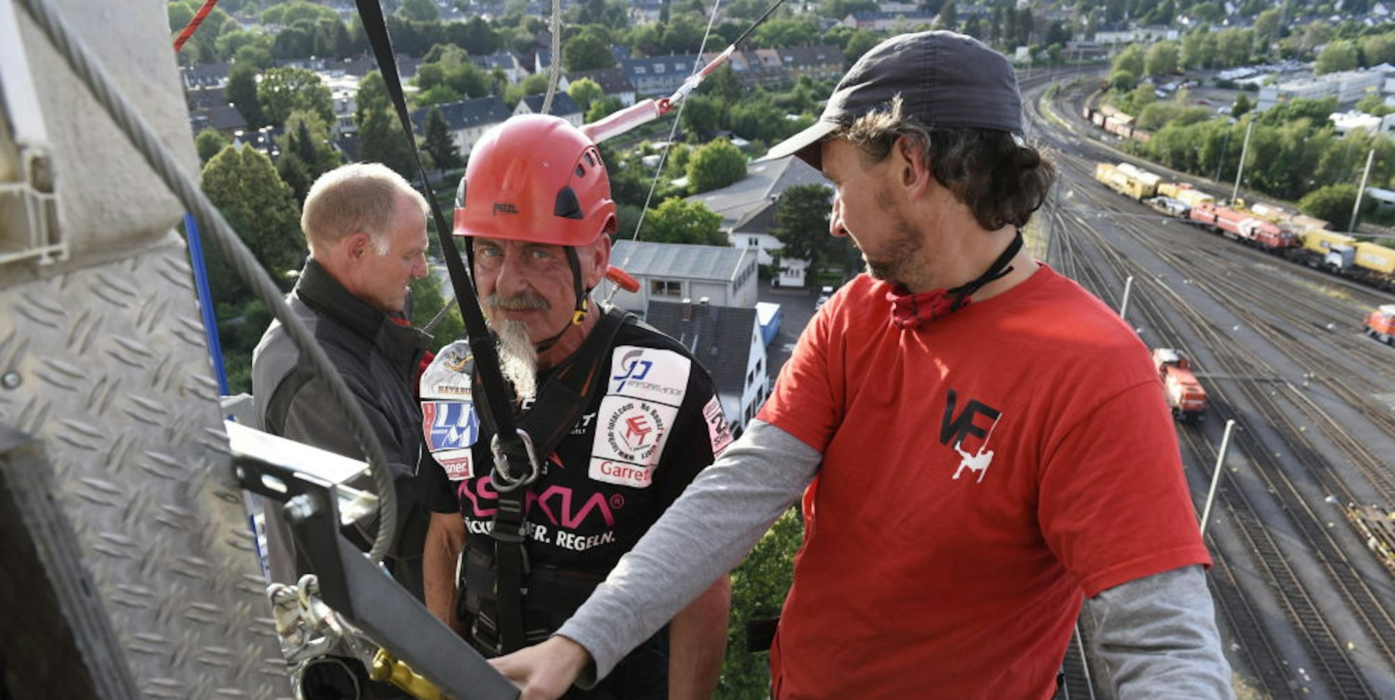 Das war kurz nach der Eröffnung am Freitagabend mit den beiden Inhabern des Kletterturms „Via Ferrata“, Raimund Bechtloff und Achim Heymann. Aber nicht allein der Skyfall ist geeignet, den Adrenalinpegel in die Höhe zu treiben. Aus einem anderen Ausstieg des Turmes können Mutige die Fassade gut gesichert im rechten Winkel herunterschreiten oder -hüpfen. An der Außenmauer haben die Betreiber des Brühler Kletterwaldes einen Klettersteig eingerichtet, der das „alpine Gefühl einer Steilwand in die Stadt“ holen soll.