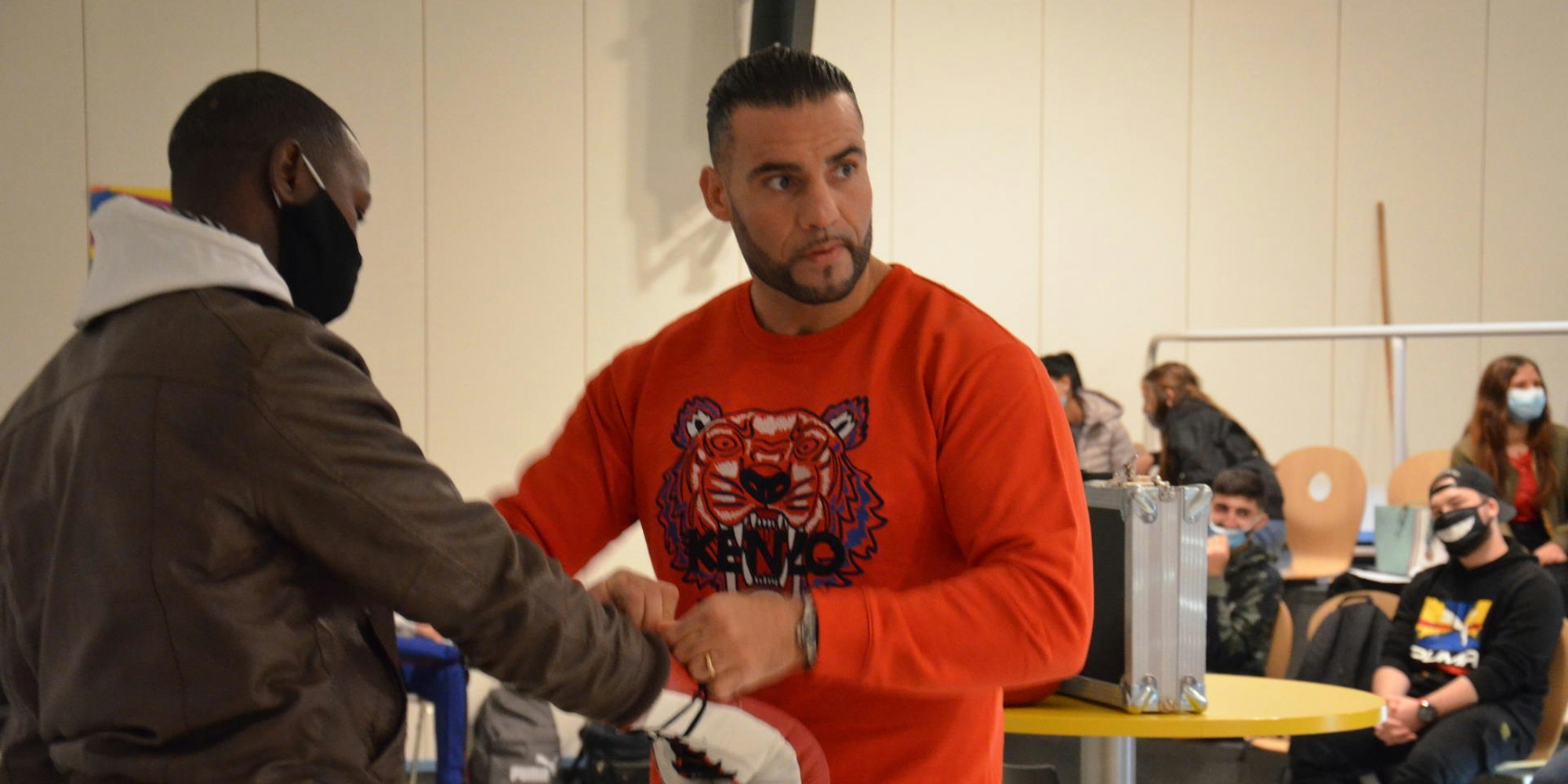Der Weltmeister suchte das Gespräch mit den Schülern, einem seiner Zuhörer legte er auch Box-Handschuhe an.