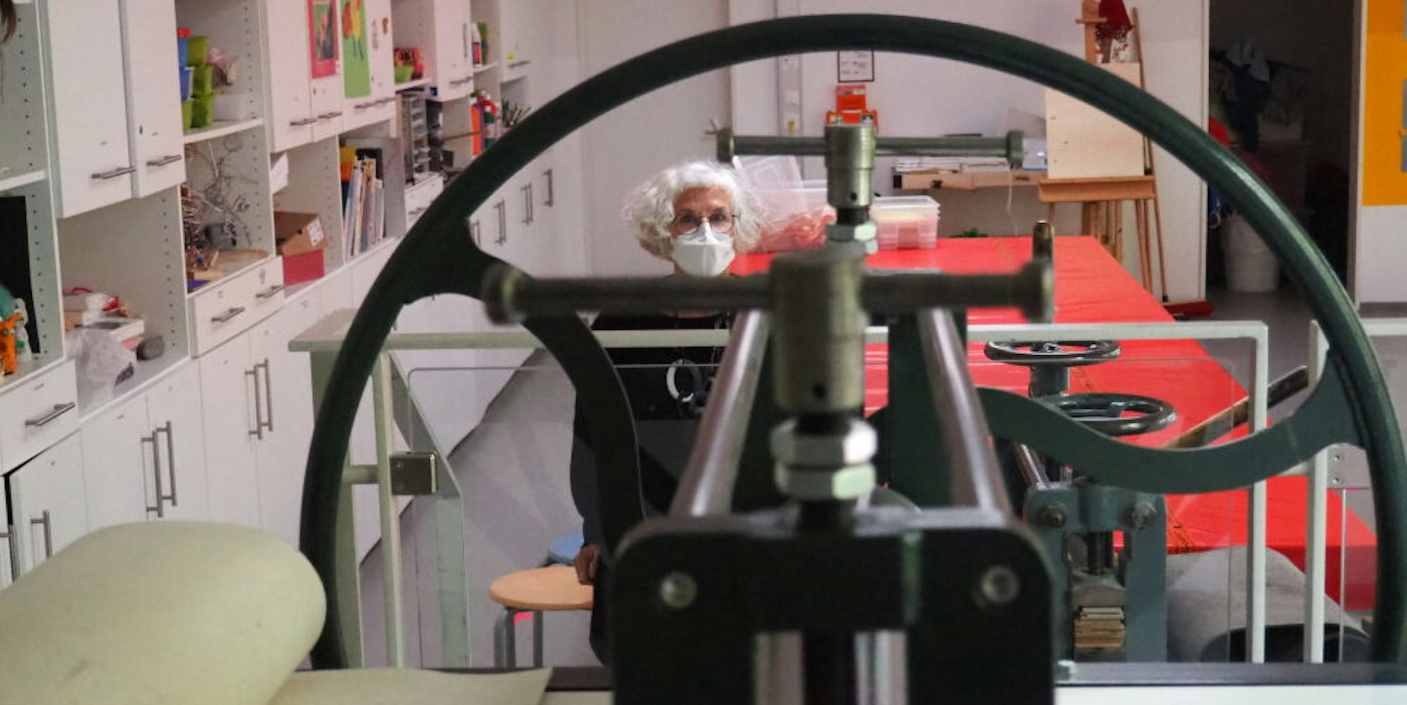 Die große Druckpresse bleibt ungenutzt. Irmgard Schifferdecker hält die Stellung im Fantasielabor, wo sonst Kinder ihre ersten Erfahrungen mit der Kunst sammeln.