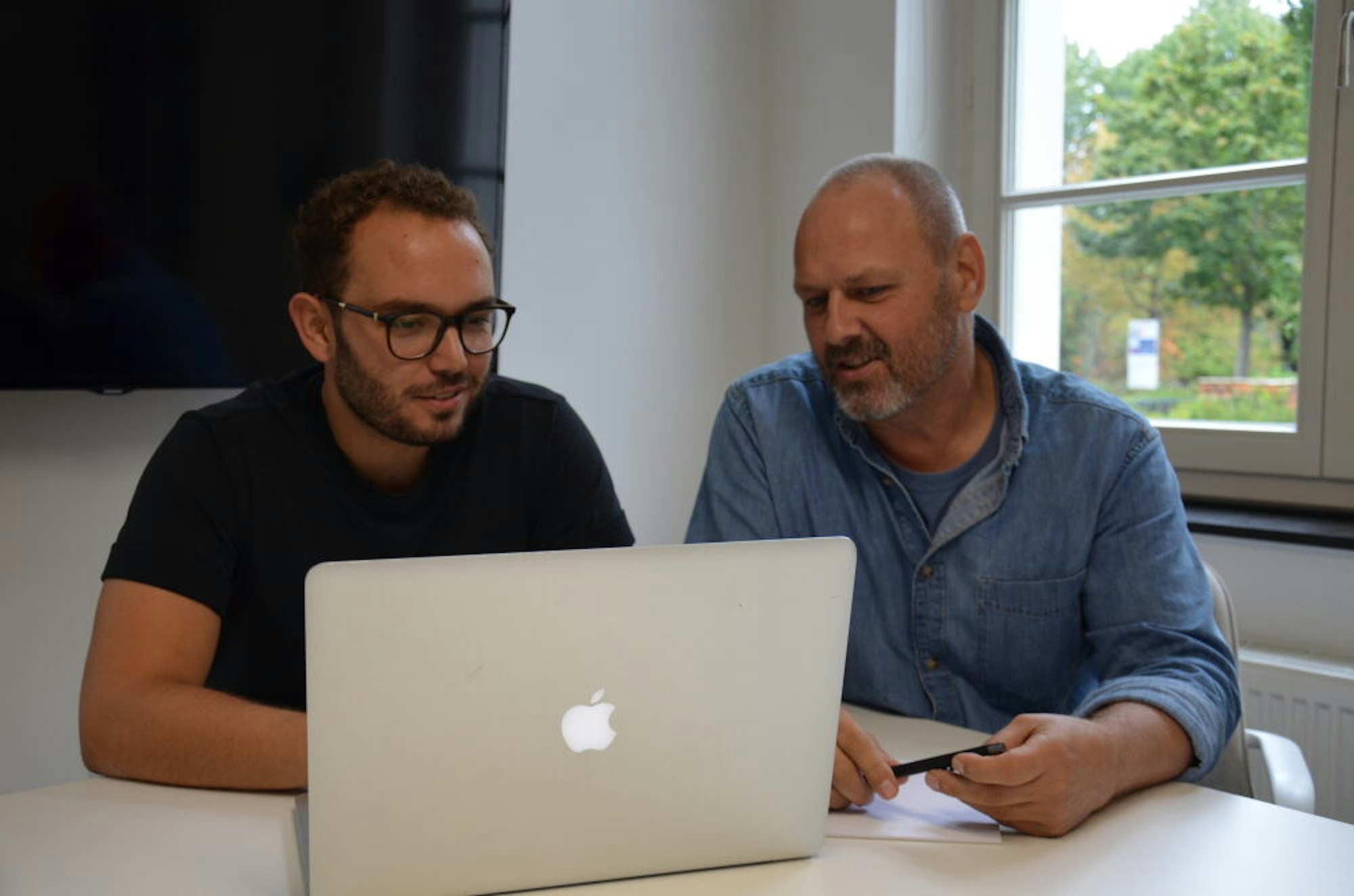 Niklas Weiler (l.) und Andreas Eßer begleiten den Testlauf der neuen Brühl-App.