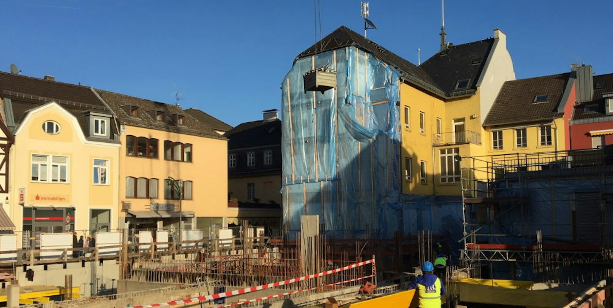 „Bis Jahresende soll die Decke des Kellergeschosses fertig sein“, sagt Gerd Schiffer, der Technische Beigeordnete der Stadt. Vier Meter hoch wird dieses Geschoss einmal sein. Denn die Räume unterhalb der Straßenebene sollen einen Teil der Stadtbücherei beherbergen und über einen an den Janshof angrenzenden Lichthof mit Tageslicht versorgt werden.