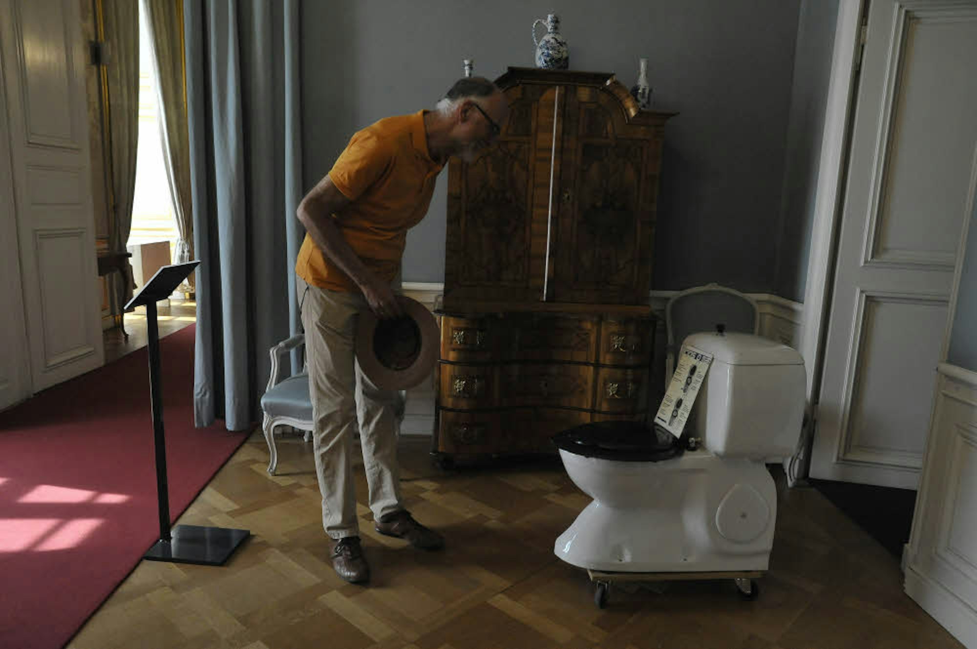 Staatsempfangsatmosphäre auch im Waschraum mit einer Toilette aus den 60er-Jahren, die einen Bidetstrahl per Fußdruck entsandte. Überhaupt erhält das Wort „Stuhlgang“ in den Ausführungen des Schlossführers eine einleuchtende, neue Bedeutung, denn einen Stuhl mit eingelassener Porzellanschüssel brachten Diener dem Kurfürsten zur Erleichterung genau dorthin, wo er eben benötigt wurde.