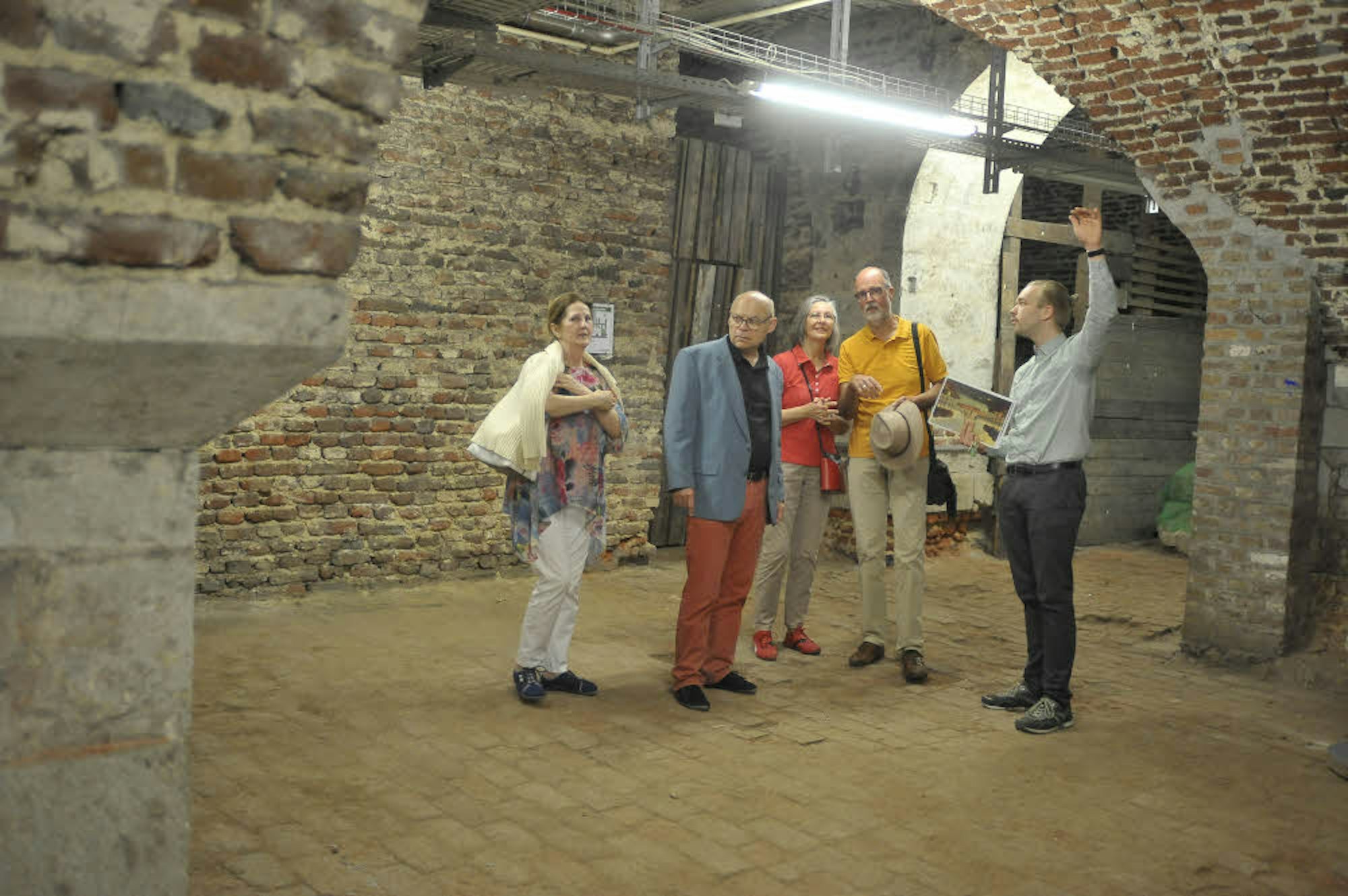 Vielmehr öffnet Ernest die niedrige Kellerklappe am Nordflügel: „Vorsicht mit dem Kopf.“ Eine staubige Treppe führt hier in ein kühles geräumiges Kellergewölbe. Schwarze Basaltfundamente und Stücke von Treppen, die ins Nirgendwo führen, erinnern an die Reste der mittelalterlichen Burg, auf deren Fundamenten das Schlossgebäude aus roten Ziegeln im 18. Jahrhundert gebaut wurde.