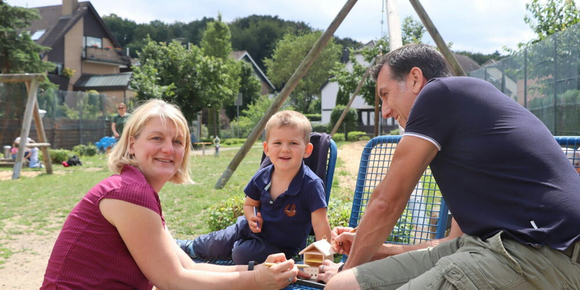 Der drei Jahre alte Leon und seine Eltern Astrid und Norbert Reuter haben viel Spaß beim Ferienprogramm des Brühler Jugendamtes.