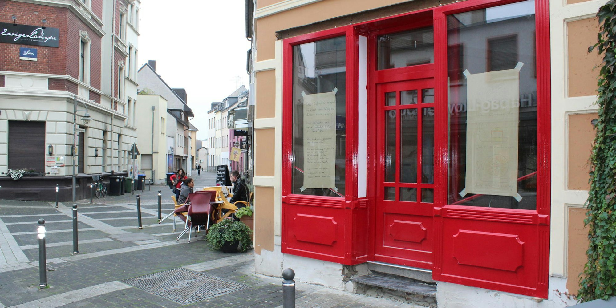 Schon im Vorbeigehen fällt der neue rote Eingang auf. Man habe die Türe in die Mitte gesetzt. Rechts und links davon gibt es jetzt Schaufenster. Vorher befand sich der Eingang in den Kiosk links. Das Ladeninnere wurde komplett kernsaniert. Freigelegte Ziegeln an einer Wand sollen demnächst für einen besonderen Charme sorgen. Die anderen Wände seien mit Lehmputz versehen, sagt Beywl. Ein Schmuckstück wird auch der neue Boden sein, der mit roten und beigen Marmorplättchen versehen ist.