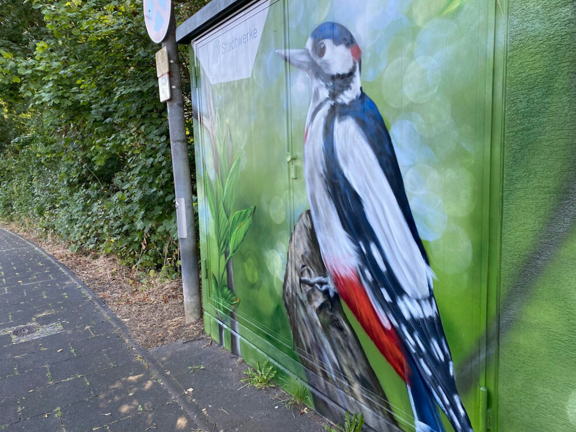 Brühl – Das Stadtgebiet ist um einige Hingucker reicher. An der Kreuzung von Alte Bohle und Neue Bohle ziert die zuvor triste Gasdruckregelstation nun das überlebensgroße Bild eines Buntspechts. Und in Vochem, wo die Hauptstraße auf die Römerstraße trifft, erschafft die neue Gestaltung der Reglerstation derzeit eine beinahe perfekte Illusion: Die aufgrund der Trockenheit der vergangenen Tage braune Rasenfläche rings um den fensterlosen Bau geht an der Fassade in eine sattgrüne, von Mohn und Gänseblümchen bestandene Wiese über.