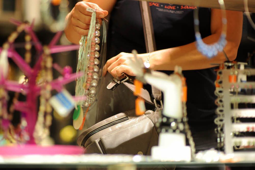 Michaela Rex hat schon drei Frauen dabei erwischt, wie sie hochwertige Einkaufstaschen vom Ständer nahmen und die Etiketten abreißen wollten. Auch im Innenraum kommt häufig Ware weg: Schmuck, Accessoires, Schokotäfelchen, Pralinen. Die Inhaberin spricht von Verlusten von bis zu 20 Prozent des Umsatzes.