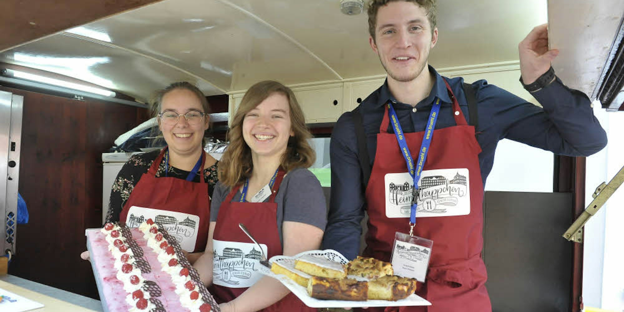 Am Sonntag warfen sich die jungen Leute selbst Küchenschürzen über und reihten sich nahtlos ins kulinarische Budengeschehen mit Speisen und Getränken aus der Region ein. Kuchen mit Äpfeln, Rhabarber und Erdbeeren boten sie selbst aus dem Heck eines Marktfahrzeuges an. „Wir haben viele Kuchen selbst gebacken, aber unsere Freunde und Familien haben auch mitgeholfen“, sagt Saskia Jungheim, natürlich habe man darauf geachtet, dass die Rezepte entweder aus altem Familienerbe oder wenigstens aus rheinischen Kochbüchern stammen.