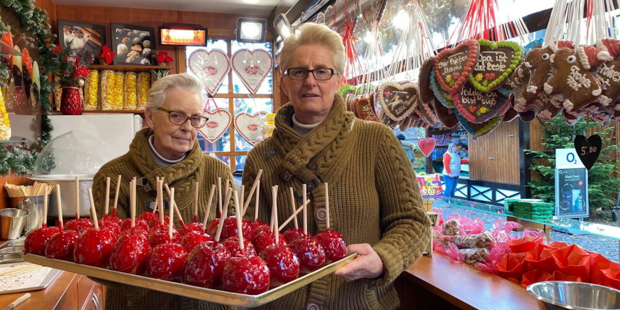 Sissi Milz (linkes Bild, r.) verkauft seit vielen Jahren Leckereien auf dem Weihnachtsmarkt.