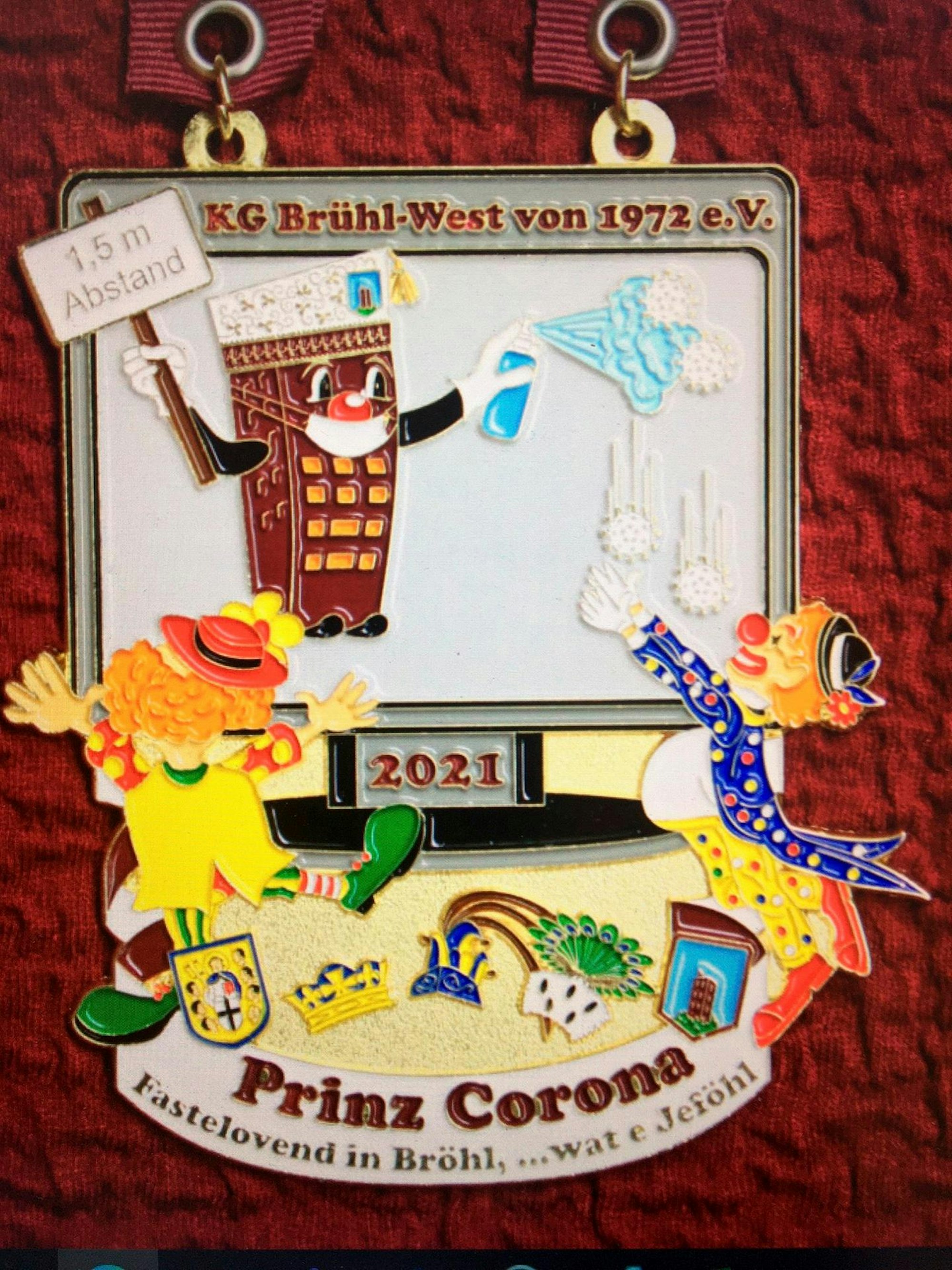Diese jecke Regentschaft ist nun auf 2024 verschoben. „Ohne Corona wäre es für uns eine besonders schöne Session geworden“, glaubt Müller. Wie auf dem Orden zu lesen ist, regiert stattdessen Prinz Corona. Das Motto „Fastelovend in Bröhl, wat e Jeföhl“ hat der ungeliebte Regent dabei übernommen. 100 Mal hat Müller den Orden produzieren lassen. In normalen Zeiten ordere er die doppelte Menge, betont er. Die meisten habe er inzwischen an aktive Mitglieder und Ehrensenatoren verteilt.