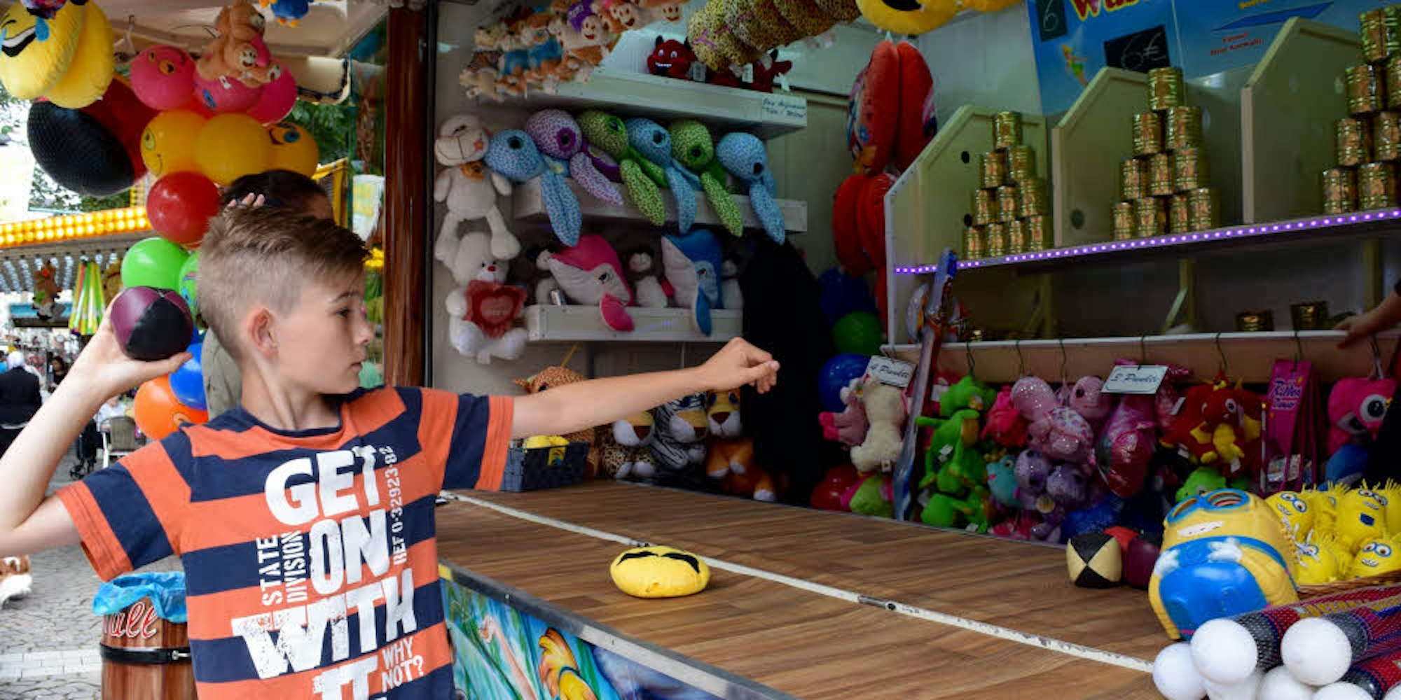 „Ran an den Ball“, „Machen Sie mit“, „Gewinnen Sie“, ruft sie immer wieder in die Menge. Der dreijährige Jonas wagt es. Er darf sich auf die Ablage knien. Jetzt ist er mit den Büchsen auf Augenhöhe. In der unteren Reihe stehen vier, darüber drei, zwei und in der oberen Reihe nur noch eine. Schnell holt der Junge aus, wirft dreimal – drei Dosen fallen zu Boden. Sein Gewinn ist ein aufblasbares Schwert. „Eigentlich gewinnt bei mir jeder, es gibt immer Trostpreise und nie nur Verlierer“, sagt die Schaustellerin. „Mir macht Dosenwerfen einfach Spaß“, freut sich der zehnjährige Enrique. Nach drei Würfen stehen noch drei Büchsen. Seine ältere Schwester schafft es sogar, dass zum Schluss nur noch zwei Dosen übrig sind.. „Meist probiere ich zuerst, eine Dose in der unteren Reihe ganz außen zu treffen“, verrät die 14-jährige Sharon. Diesen Tipp müsse sie den älteren Jungs meist nicht mehr verraten, weiß Aufermann. „Das haben die meisten gut drauf“.